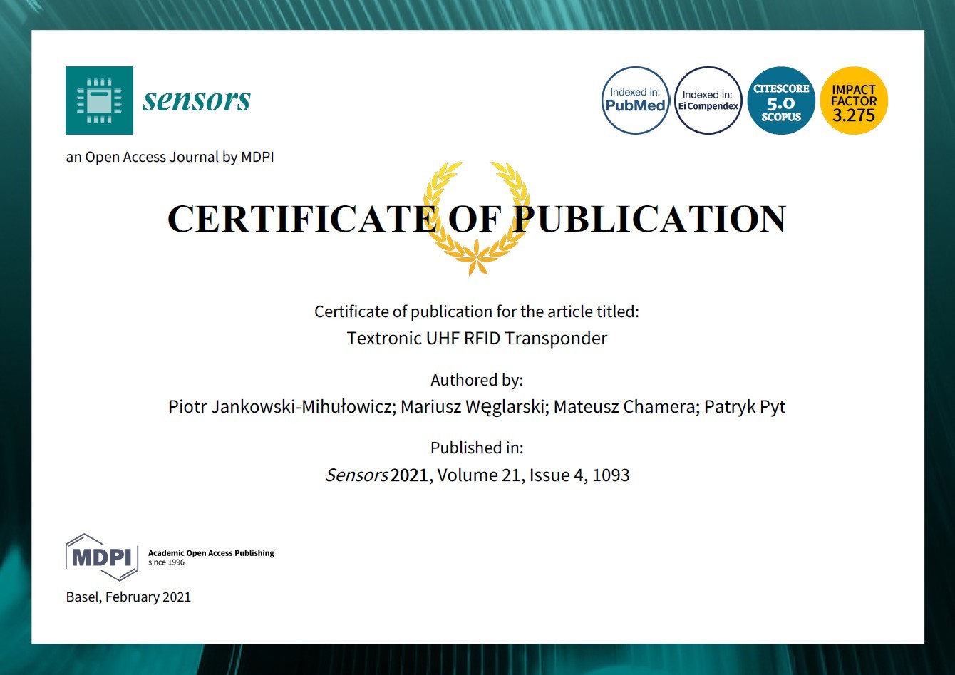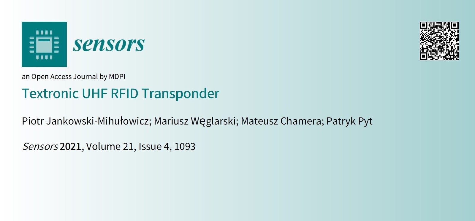 Jankowski-Mihułowicz P., Węglarski M., Chamera M., Pyt P.: Textronic UHF RFID Transponder, Sensors, ISSN: 1424-8220, Vol. 21, No. 4, 1093, 2021 (DOI: 10.3390/s21041093).