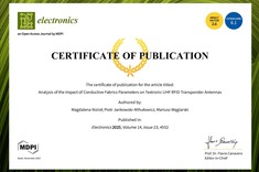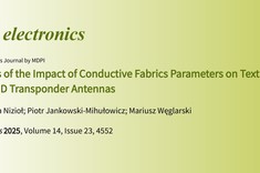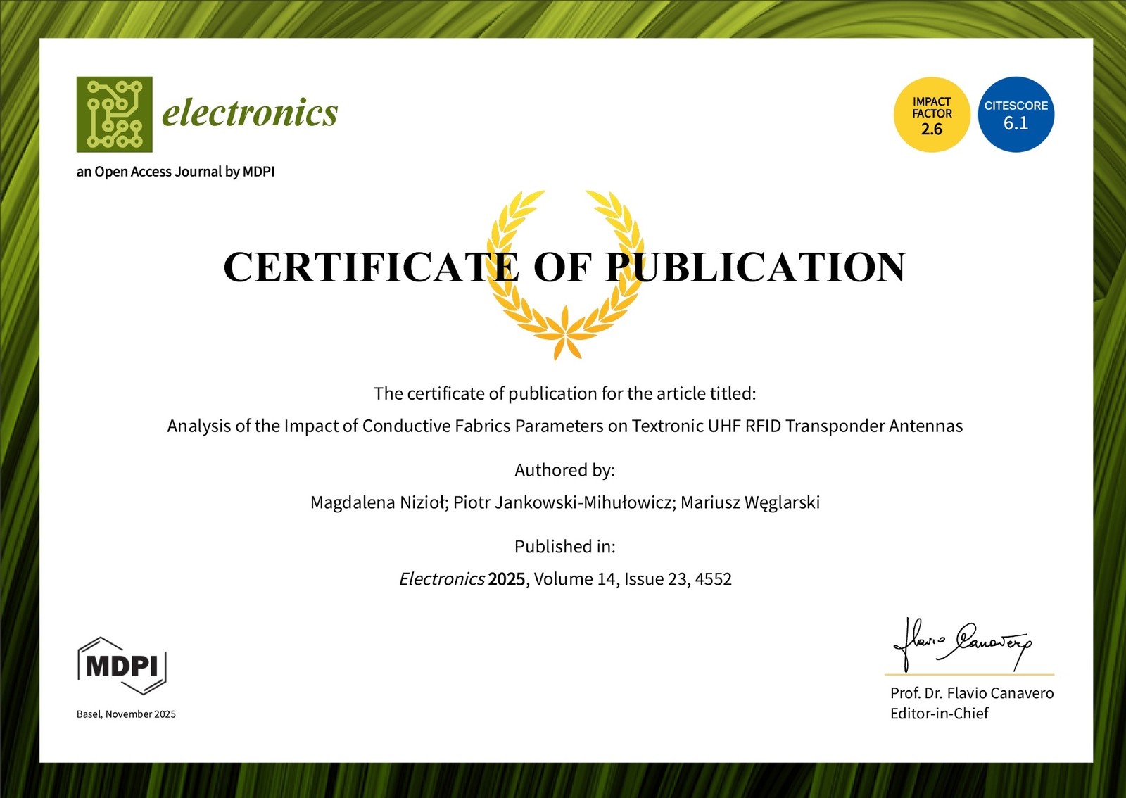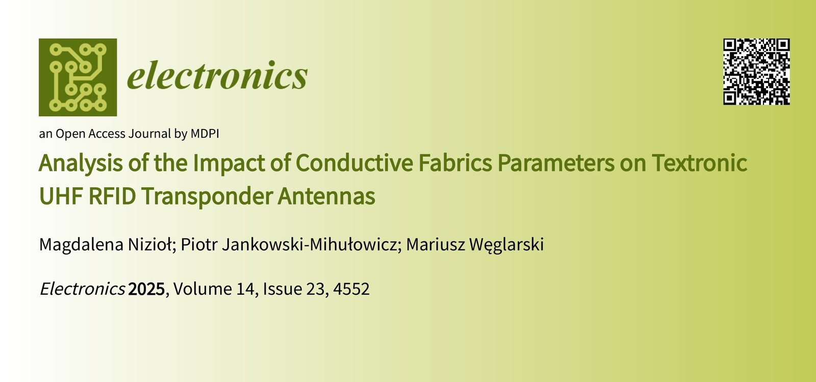 Nizioł M., Jankowski-Mihułowicz P., Węglarski M.: Analysis of the Impact of Conductive Fabrics Parameters on Textronic UHF RFID Transponder Antennas, Electronics, Vol. 14, No. 23, 4552, 2025 (DOI: 10.3390/electronics14234552).