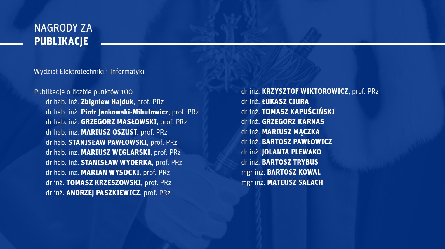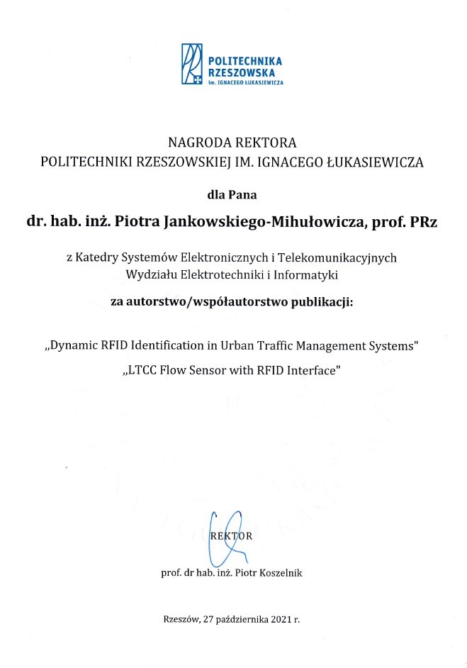 27 października 2021 r. trzej pracownicy Katedry Systemów Elektronicznych i Telekomunikacyjnych: dr hab. inż. Piotr Jankowski-Mihułowicz, prof. PRz, dr hab. inż. Mariusz Węglarski, prof. PRz oraz dr inż. Bartosz Pawłowicz, otrzymali dwie zespołowe nagrody Rektora PRz za osiągnięcia naukowe uzyskane w 2020 r.: