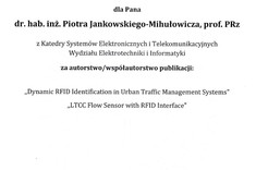 - Pawłowicz B., Trybus B., Salach M., Jankowski-Mihułowicz P: Dynamic RFID Identification in Urban Traffic Management Systems, Sensors, ISSN: 1424-8220, Vol. 20, No. 15, 4225, 2020 (DOI: 10.3390/s20154225);
