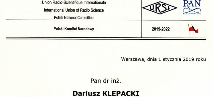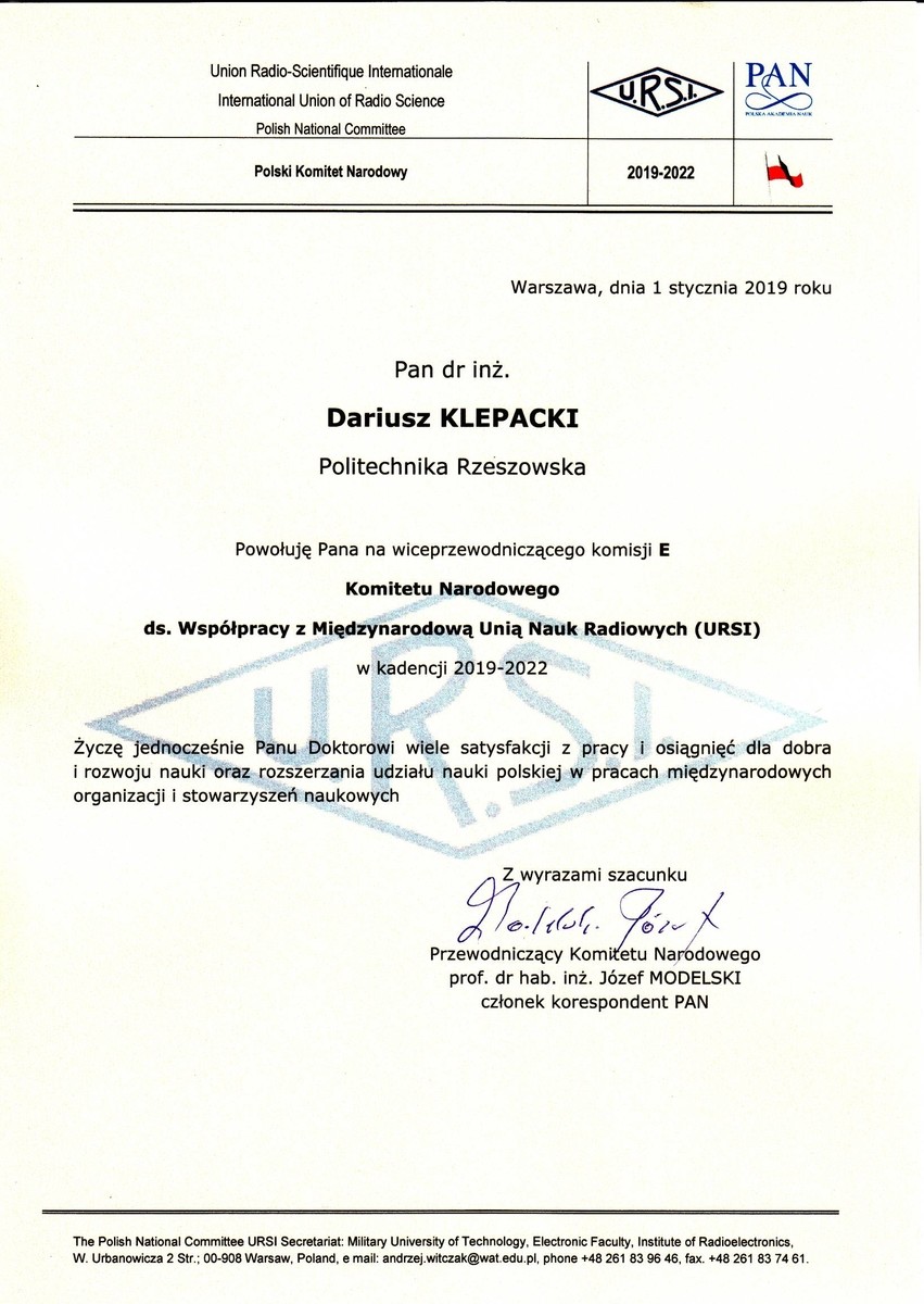 Mamy zaszczyt przekazać informację, że nasz Kolega dr inż. Dariusz Klepacki, adiunkt w Katedrze Systemów Elektronicznych i Telekomunikacyjnych na Wydziale Elektrotechniki i Informatyki Politechniki Rzeszowskiej, w kadencji 2019-2022 otrzymał nominację na wiceprzewodniczącego Komisji E „Szumów i zakłóceń elektromagnetycznych” (ang. Electromagnetic Noise and Interference) Komitetu Narodowego ds. Współpracy z Międzynarodową Unią Nauk Radiowych (URSI – fr. Union Radio-Scientifique Internationale, ang. International Union of Radio Science).