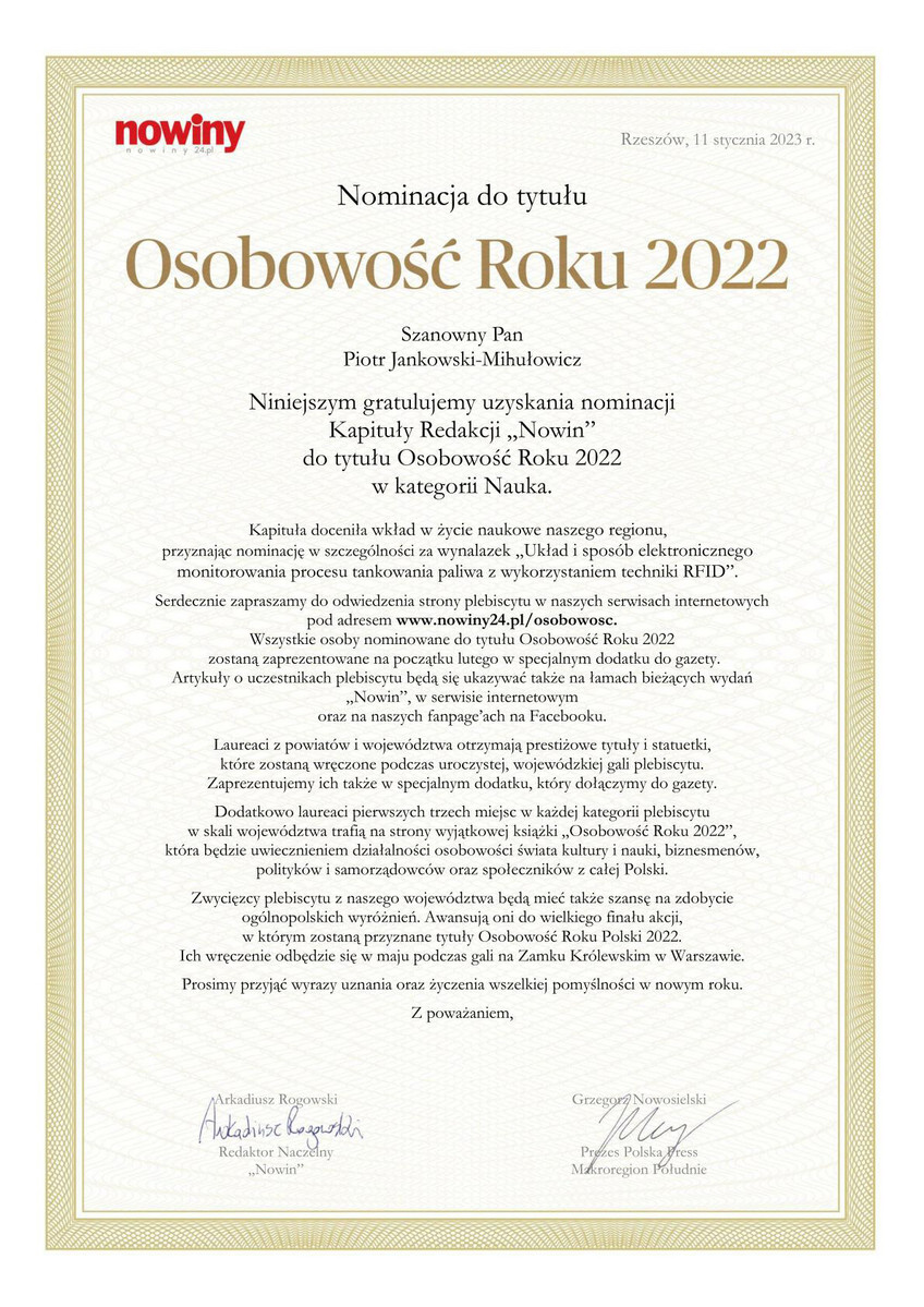 W dniu 11 stycznia 2023 r. Kapituła Redakcji Gazety Codziennej „Nowiny” nominowała dra hab. inż. Piotra Jankowskiego-Mihułowicza, prof. PRz do tytułu Osobowość Roku 2022 w kategorii Nauka. Kapituła doceniła wkład kandydata w życie naukowe Podkarpacia przyznając tę nominację w szczególności za osiągnięcia naukowe w obszarze elektroniki i telekomunikacji, ze szczególnym uwzględnieniem zagadnień nowoczesnej techniki radiowej identyfikacji obiektów (RFID – ang. Radio Frequency IDentification).