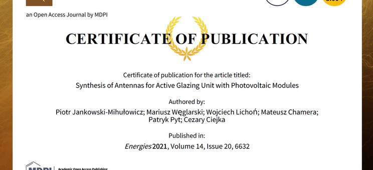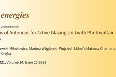 Jankowski-Mihułowicz P., Węglarski M., Lichoń W., Chamera M., Pyt P., Ciejka C.: Synthesis of antennas for active glazing unit with photovoltaic modules, Energies, ISSN: 1996-1073, Vol. 14, No. 20, 6632, 2021 (DOI: 10.3390/en14206632).