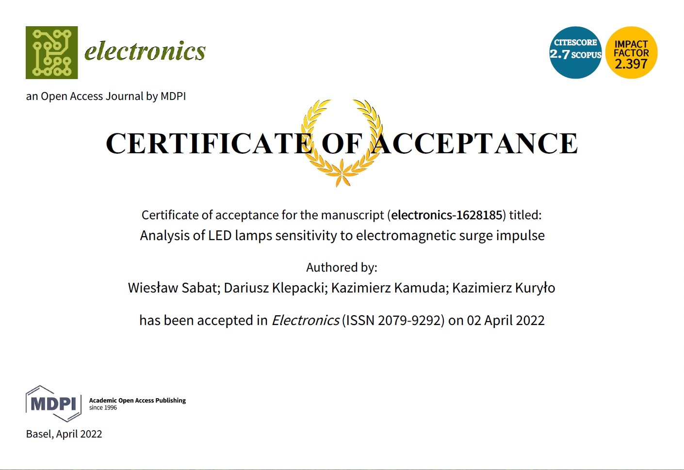 Sabat, W.; Klepacki, D.; Kamuda, K.; Kuryło, K.: Analysis of LED Lamps’ Sensitivity to Surge Impulse. Electronics 2022, 11 (7), 1140; https://doi.org/10.3390/electronics11071140
