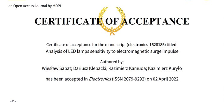 W dniu 04 kwietnia 2022 r. w czasopiśmie MDPI Electronics (MEiN 100 pkt, IF: 2.379) ukazała się nasza nowa publikacja dotycząca prac związanych z kompatybilnością elektromagnetyczną: