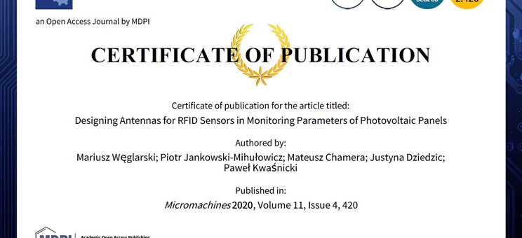 Węglarski M., Jankowski-Mihułowicz P., Chamera M., Dziedzic J., Kwaśnicki P.: Designing Antennas for RFID Sensors in Monitoring Parameters of Photovoltaic Panels, Micromachines, 420, ISSN: 2072-666X, Vol. 11, No. 4, 420, 2020 (DOI: 10.3390/s20010268).