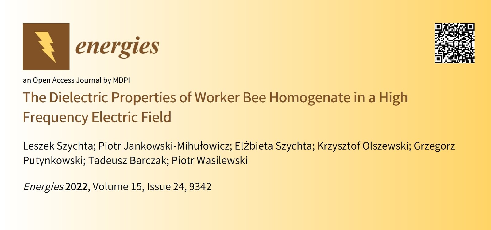 Szychta L., Jankowski-Mihułowicz P., Szychta E., Olszewski K., Putynkowski G., Barczak T., Wasilewski P.: The Dielectric Properties of Worker Bee Homogenate in a High Frequency Electric Field, Energies, Vol. 15, No. 24, 9342, 2022 (DOI: 10.3390/en15249342).