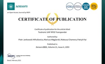 W dniu 5 lutego 2021 r. ukazała się nowa publikacja: 1. Jankowski-Mihułowicz P., Węglarski M., Chamera M., Pyt P.: Textronic UHF RFID Transponder, Sensors (...)