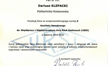 Kolega dr inż. Dariusz Klepacki w kadencji 2019-2022 otrzymał nominację na wiceprzewodniczącego Komisji E Komitetu Narodowego ds. Współpracy z Międzynarodową Unią Nauk Radiowych (URSI)...
