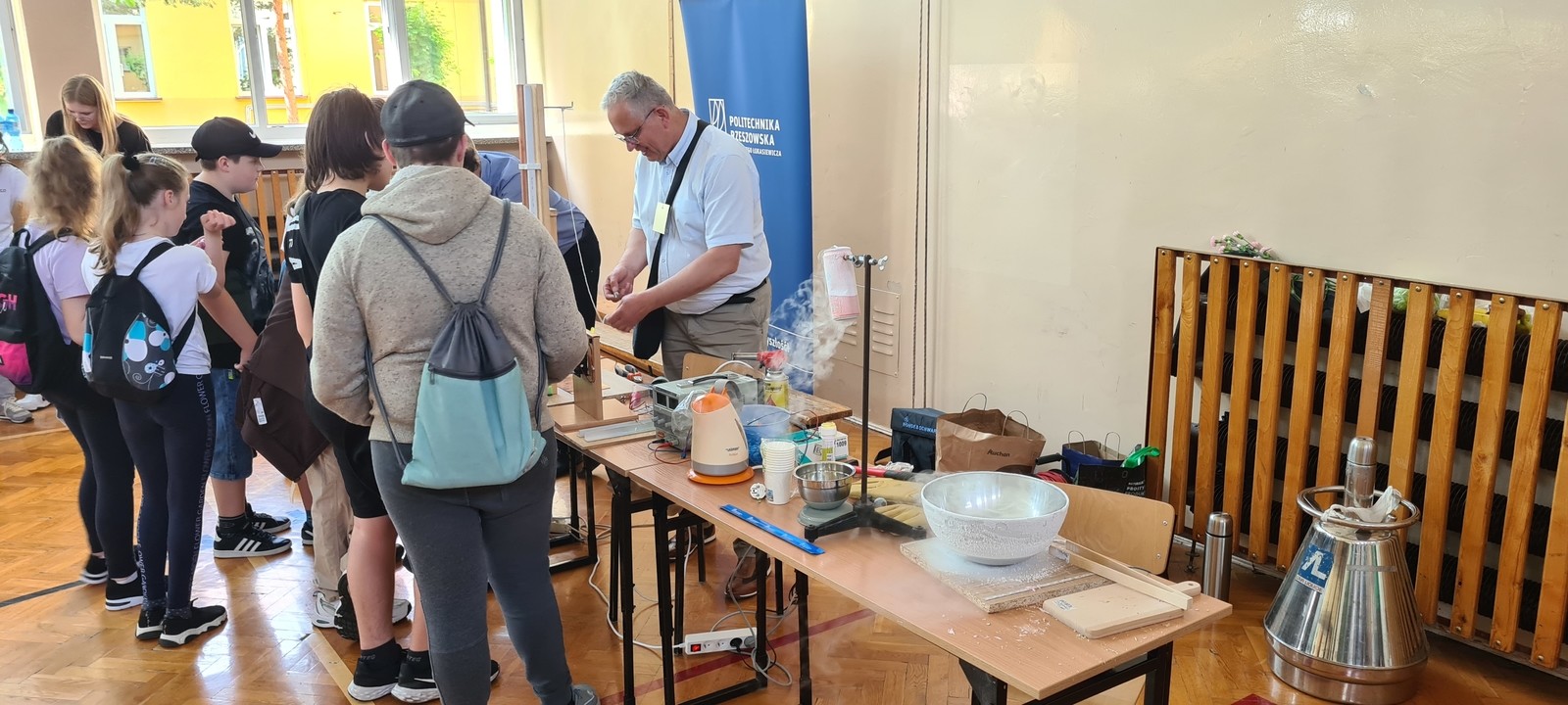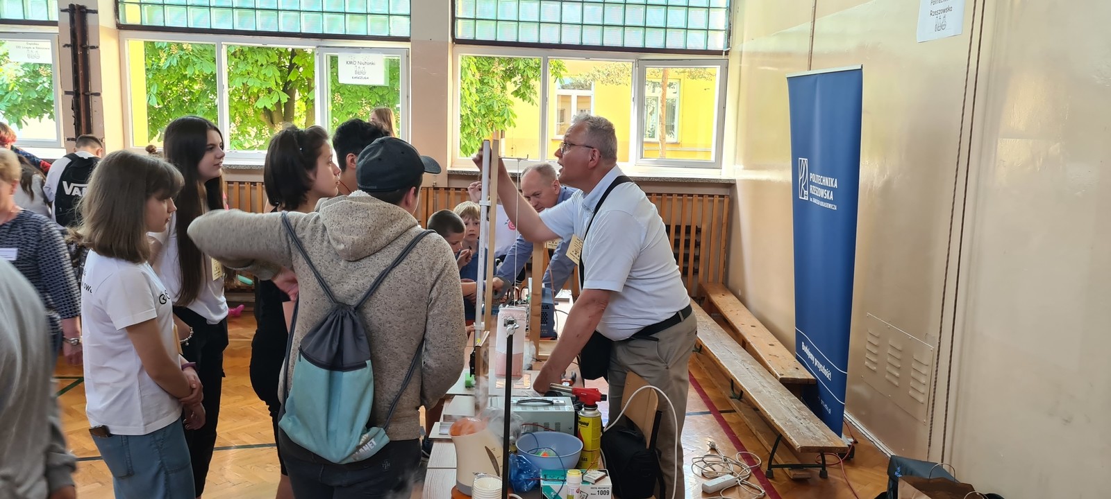 Zespół KSEiT w składzie dr inż. Kazimierz Kuryło, dr inż. Wiesław Sabat oraz dr inż. Dariusz Klepacki zaprezentowali licznie zgromadzonej młodzieży zagadnienia związane z podstawami elektromagnetyzmu oraz fizyki ciała stałego w niskich temperaturach (z wykorzystaniem ciekłego azotu). Efektowne doświadczenia i pokazy cieszyły się dużym zainteresowaniem uczestników, którzy oprócz ciekawie zaprezentowanej wiedzy otrzymywali również drobne upominki ufundowane przez Politechnikę Rzeszowską w postaci gadżetów firmowych.