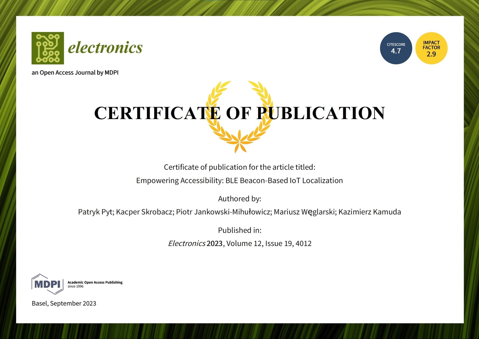 Pyt P., Skrobacz K., Jankowski-Mihułowicz P., Węglarski M., Kamuda K.: Empowering Accessibility: BLE Beacon-Based IoT Localization, Electronics, Vol. 12, No. 19, 4012, 2023 (DOI:10.3390/en16062626).