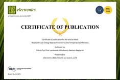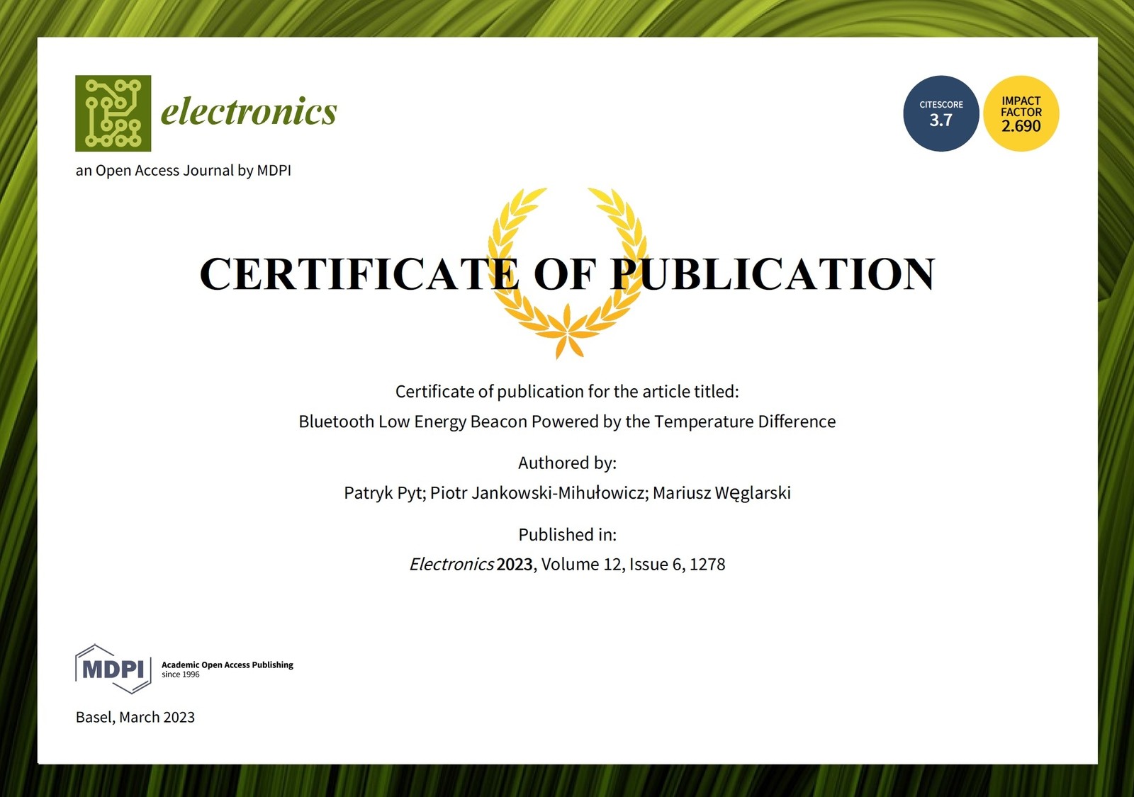 Pyt P., Jankowski-Mihułowicz P., Węglarski M.: Bluetooth Low Energy Beacon Powered by the Temperature Difference, Electronics, Vol. 12, No. 6, 1278, 2023 (10.3390/electronics12061278).
