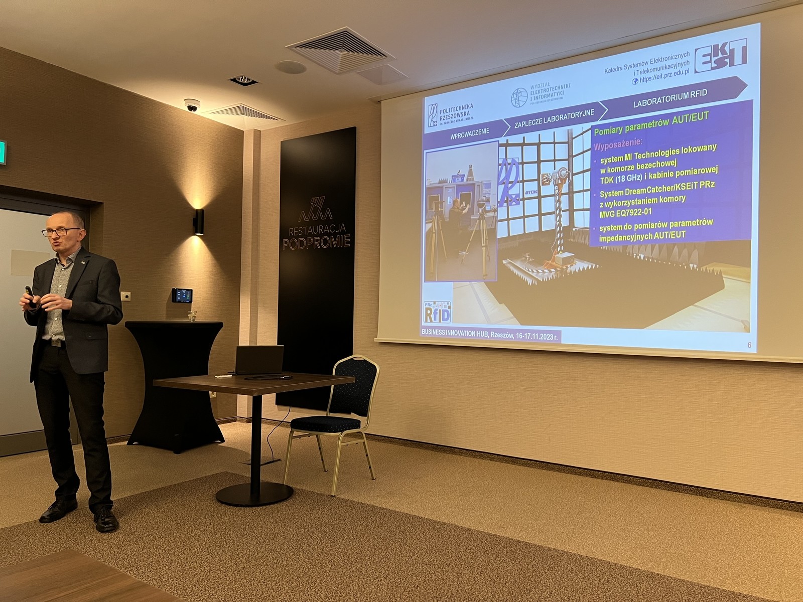 - dr hab inż. Piotr Jankowski-Mihułowcz, prof. PRz zaprezentował projekty Katedry Systemów Elektronicznych i Telekomunikacyjnych PRz z obszaru techniki RFID o istotnym potencjale komercjalizacyjnym, a także zakres współpracy z partnerami przemysłowymi;