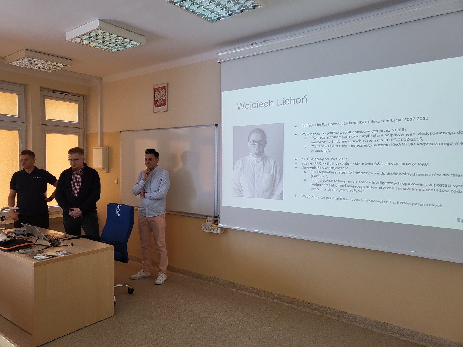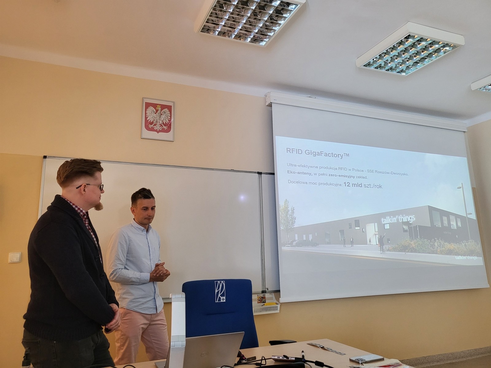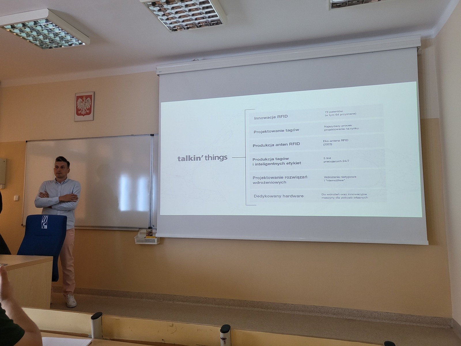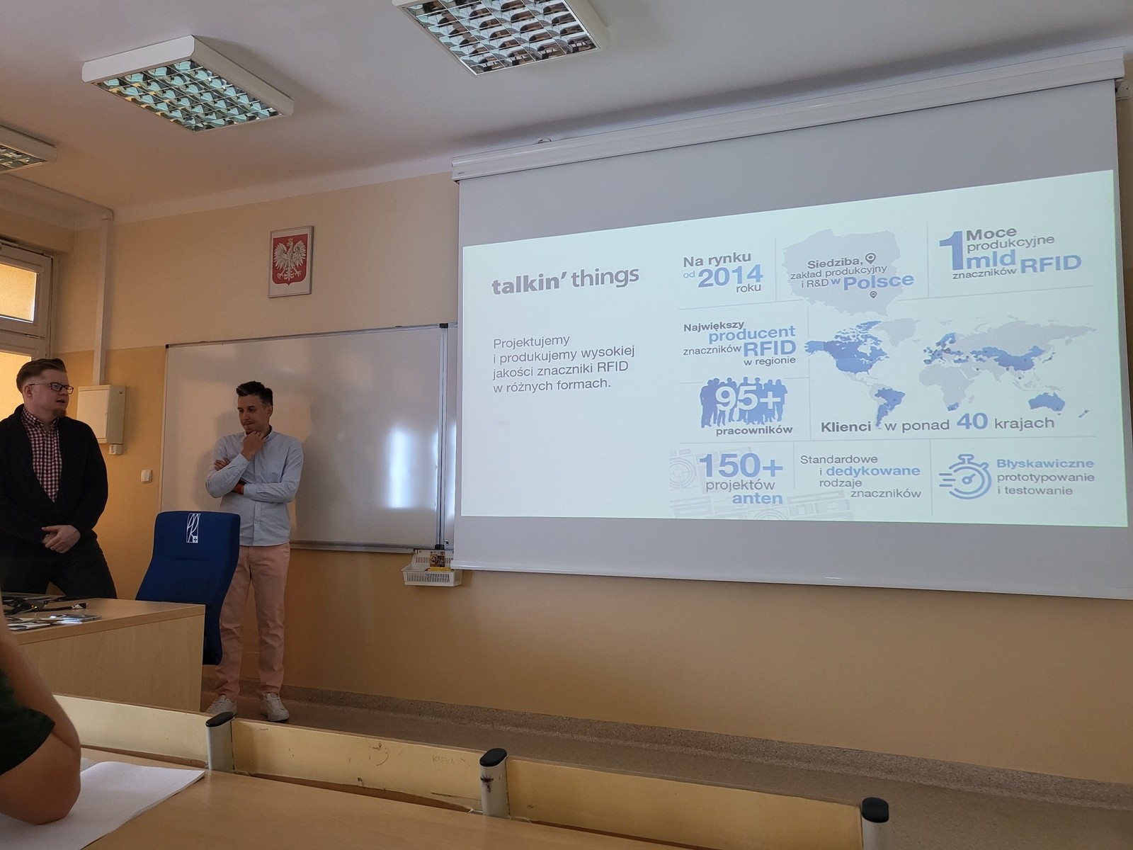 W dniu 6 czerwca 2023 roku studenci ostatniego semestru studiów II stopnia na kierunku elektronika i telekomunikacja, w ramach kończących się zajęć z modułu pn. technika radiowej identyfikacji obiektów, mieli okazję do spotkania się z przedstawicielami firmy Talkin’ Things, które zostało zorganizowane z inicjatywy dra hab. inż. Piotra Jankowskiego-Mihułowicza, prof. PRz. W trakcie spotkania odbył się wykład, podczas którego mgr inż. Wojciech Lichoń (Head of R&D), mgr inż. Damian Kawalec (RFID Expert/Sales Manager) oraz mgr inż. Mateusz Chamera (Lead of RFID Tag Development) wpierw zaprezentowali studentom Wydziału Elektrotechniki i Informatyki swoje sylwetki zawodowe, a następnie przedstawili projektowo-produkcyjny profil działalności firmy w zakresie techniki RFID. Podczas prezentacji omawiane były konkretne przykłady projektowania, prototypowania i produkcji w Talkin’ Things identyfikatorów RFID, które znajdują powszechne zastosowania w zautomatyzowanych procesach takich firm, jak np.: Decathlon, Inditex, Boehringer Ingelheim, Sato, Nestle, Calzedonia, L'Oréal, Sanofi, Mango, Goodwill, Mars, Coca-Cola, GSK, P&G, TAKARA-TOMY Company. Było to doskonałe uzupełnienie wiedzy, jaką studenci zdobywali podczas realizowanych zajęć dydaktycznych w przedmiotowym zakresie.