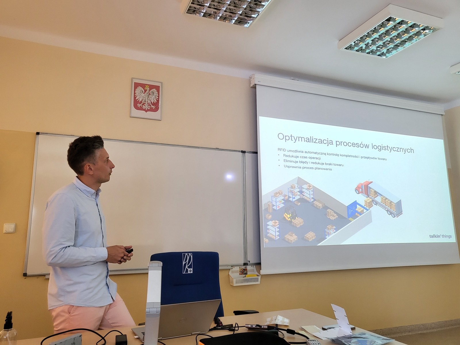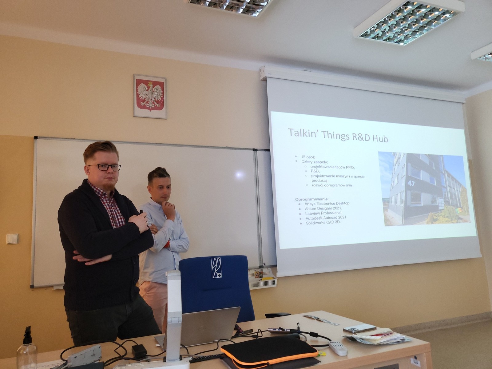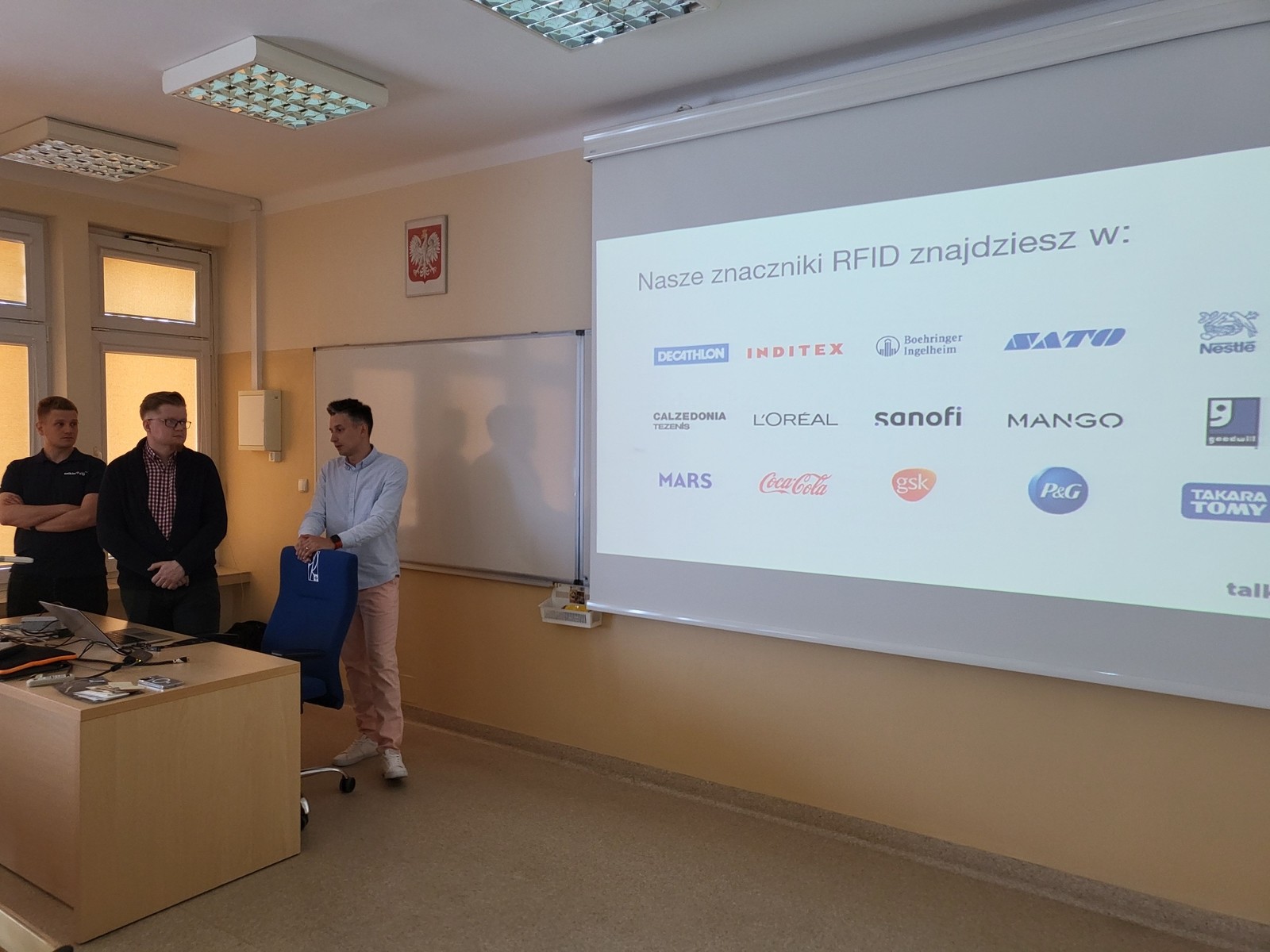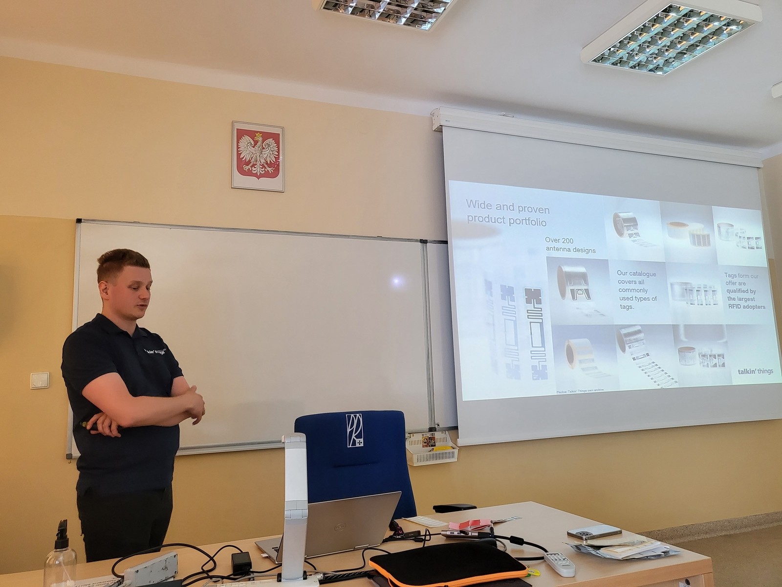 W dniu 6 czerwca 2023 roku studenci ostatniego semestru studiów II stopnia na kierunku elektronika i telekomunikacja, w ramach kończących się zajęć z modułu pn. technika radiowej identyfikacji obiektów, mieli okazję do spotkania się z przedstawicielami firmy Talkin’ Things, które zostało zorganizowane z inicjatywy dra hab. inż. Piotra Jankowskiego-Mihułowicza, prof. PRz. W trakcie spotkania odbył się wykład, podczas którego mgr inż. Wojciech Lichoń (Head of R&D), mgr inż. Damian Kawalec (RFID Expert/Sales Manager) oraz mgr inż. Mateusz Chamera (Lead of RFID Tag Development) wpierw zaprezentowali studentom Wydziału Elektrotechniki i Informatyki swoje sylwetki zawodowe, a następnie przedstawili projektowo-produkcyjny profil działalności firmy w zakresie techniki RFID. Podczas prezentacji omawiane były konkretne przykłady projektowania, prototypowania i produkcji w Talkin’ Things identyfikatorów RFID, które znajdują powszechne zastosowania w zautomatyzowanych procesach takich firm, jak np.: Decathlon, Inditex, Boehringer Ingelheim, Sato, Nestle, Calzedonia, L'Oréal, Sanofi, Mango, Goodwill, Mars, Coca-Cola, GSK, P&G, TAKARA-TOMY Company. Było to doskonałe uzupełnienie wiedzy, jaką studenci zdobywali podczas realizowanych zajęć dydaktycznych w przedmiotowym zakresie.