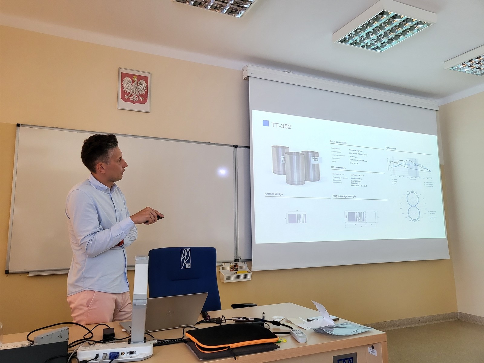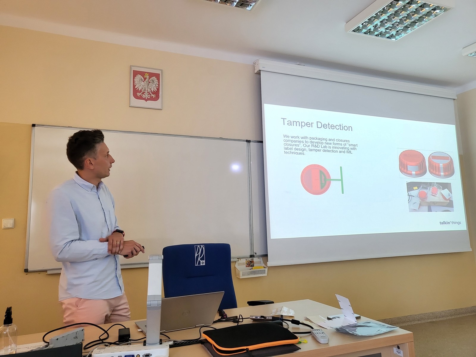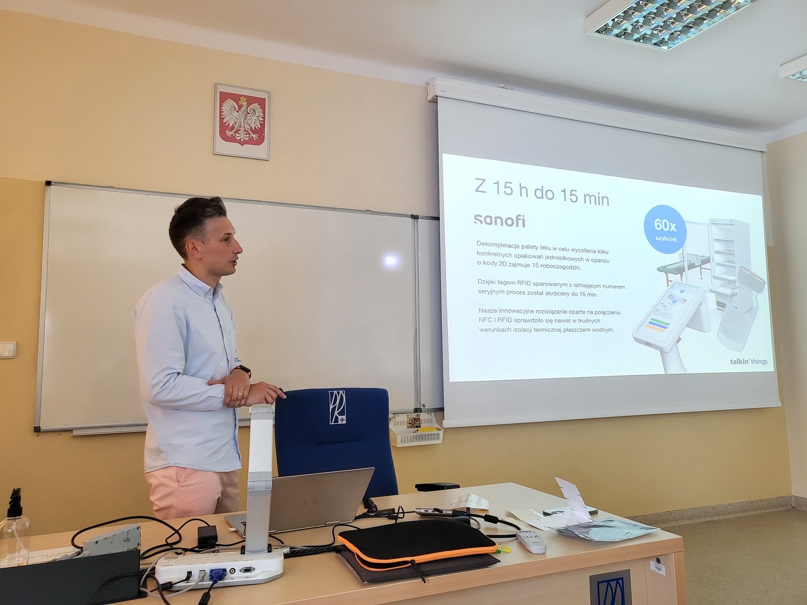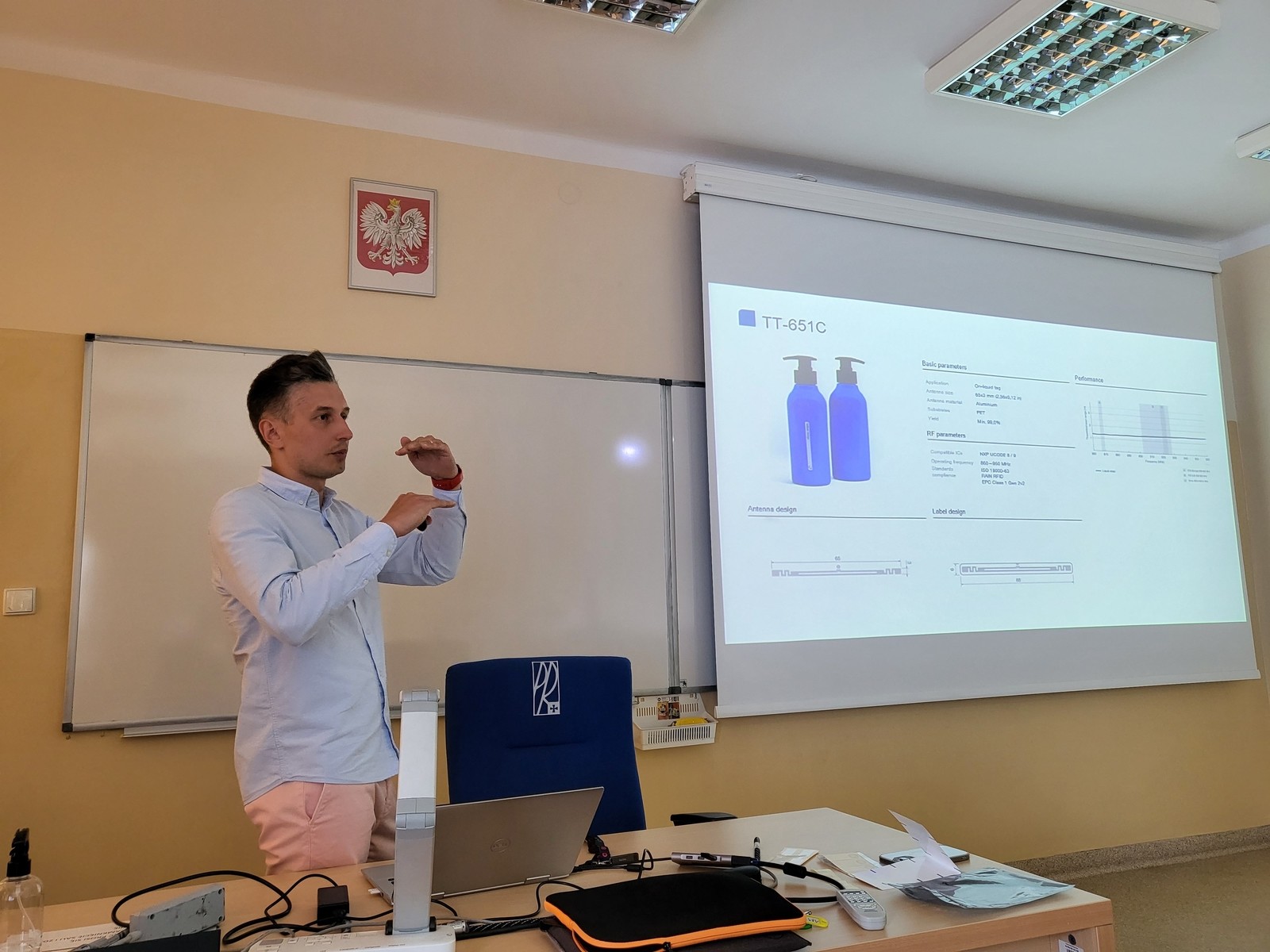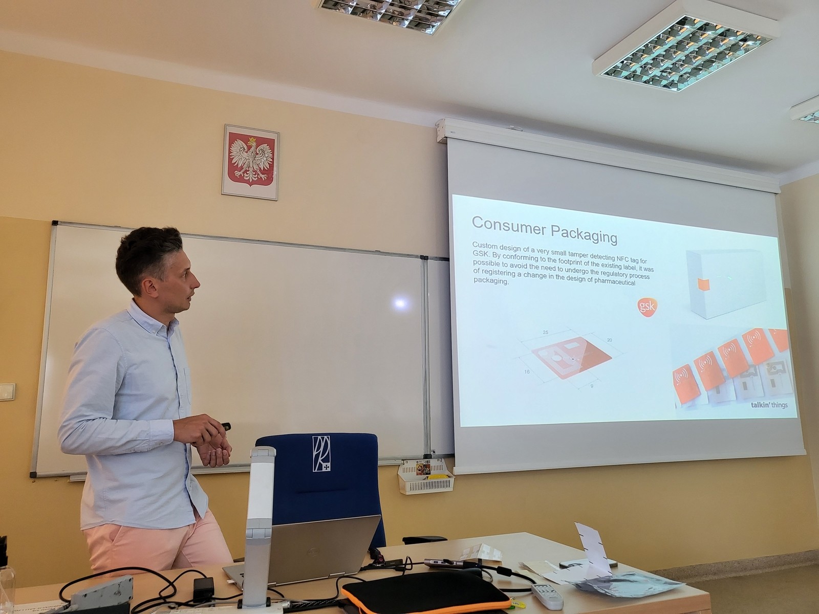 W dniu 6 czerwca 2023 roku studenci ostatniego semestru studiów II stopnia na kierunku elektronika i telekomunikacja, w ramach kończących się zajęć z modułu pn. technika radiowej identyfikacji obiektów, mieli okazję do spotkania się z przedstawicielami firmy Talkin’ Things, które zostało zorganizowane z inicjatywy dra hab. inż. Piotra Jankowskiego-Mihułowicza, prof. PRz. W trakcie spotkania odbył się wykład, podczas którego mgr inż. Wojciech Lichoń (Head of R&D), mgr inż. Damian Kawalec (RFID Expert/Sales Manager) oraz mgr inż. Mateusz Chamera (Lead of RFID Tag Development) wpierw zaprezentowali studentom Wydziału Elektrotechniki i Informatyki swoje sylwetki zawodowe, a następnie przedstawili projektowo-produkcyjny profil działalności firmy w zakresie techniki RFID. Podczas prezentacji omawiane były konkretne przykłady projektowania, prototypowania i produkcji w Talkin’ Things identyfikatorów RFID, które znajdują powszechne zastosowania w zautomatyzowanych procesach takich firm, jak np.: Decathlon, Inditex, Boehringer Ingelheim, Sato, Nestle, Calzedonia, L'Oréal, Sanofi, Mango, Goodwill, Mars, Coca-Cola, GSK, P&G, TAKARA-TOMY Company. Było to doskonałe uzupełnienie wiedzy, jaką studenci zdobywali podczas realizowanych zajęć dydaktycznych w przedmiotowym zakresie.