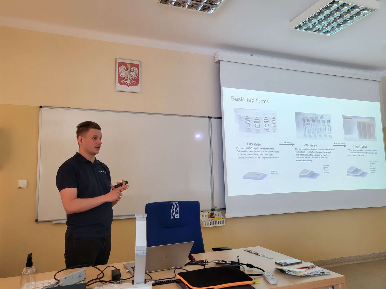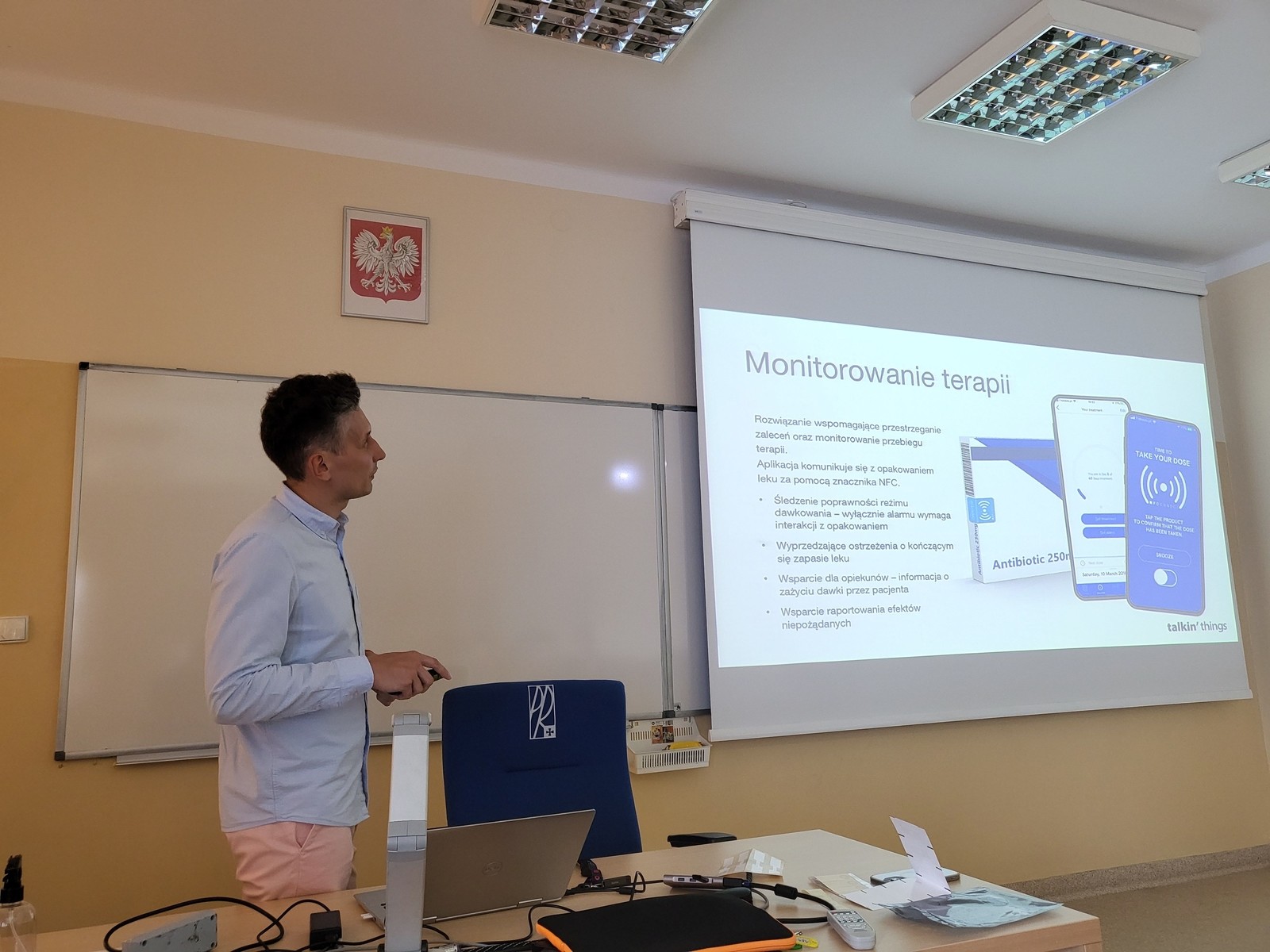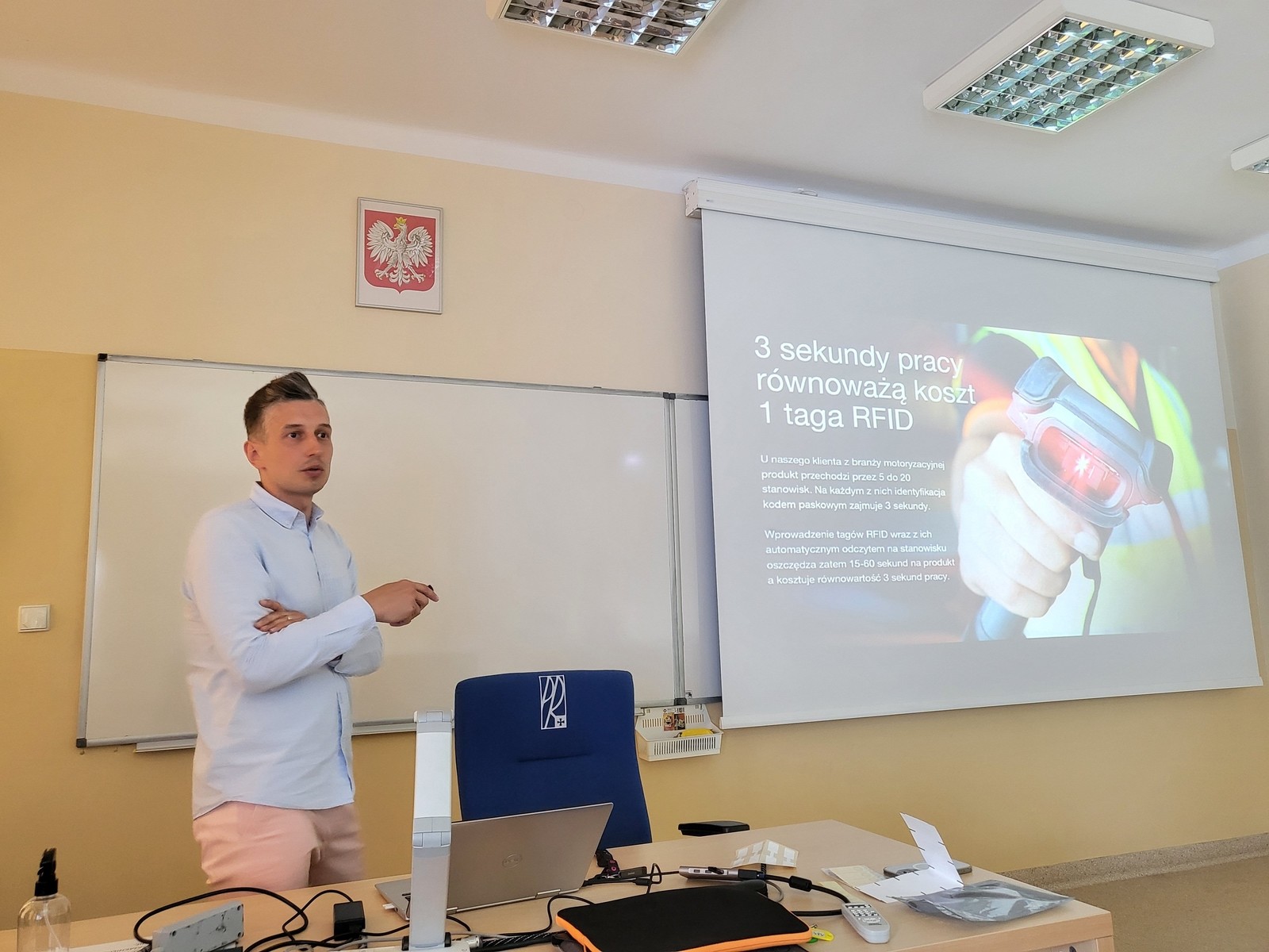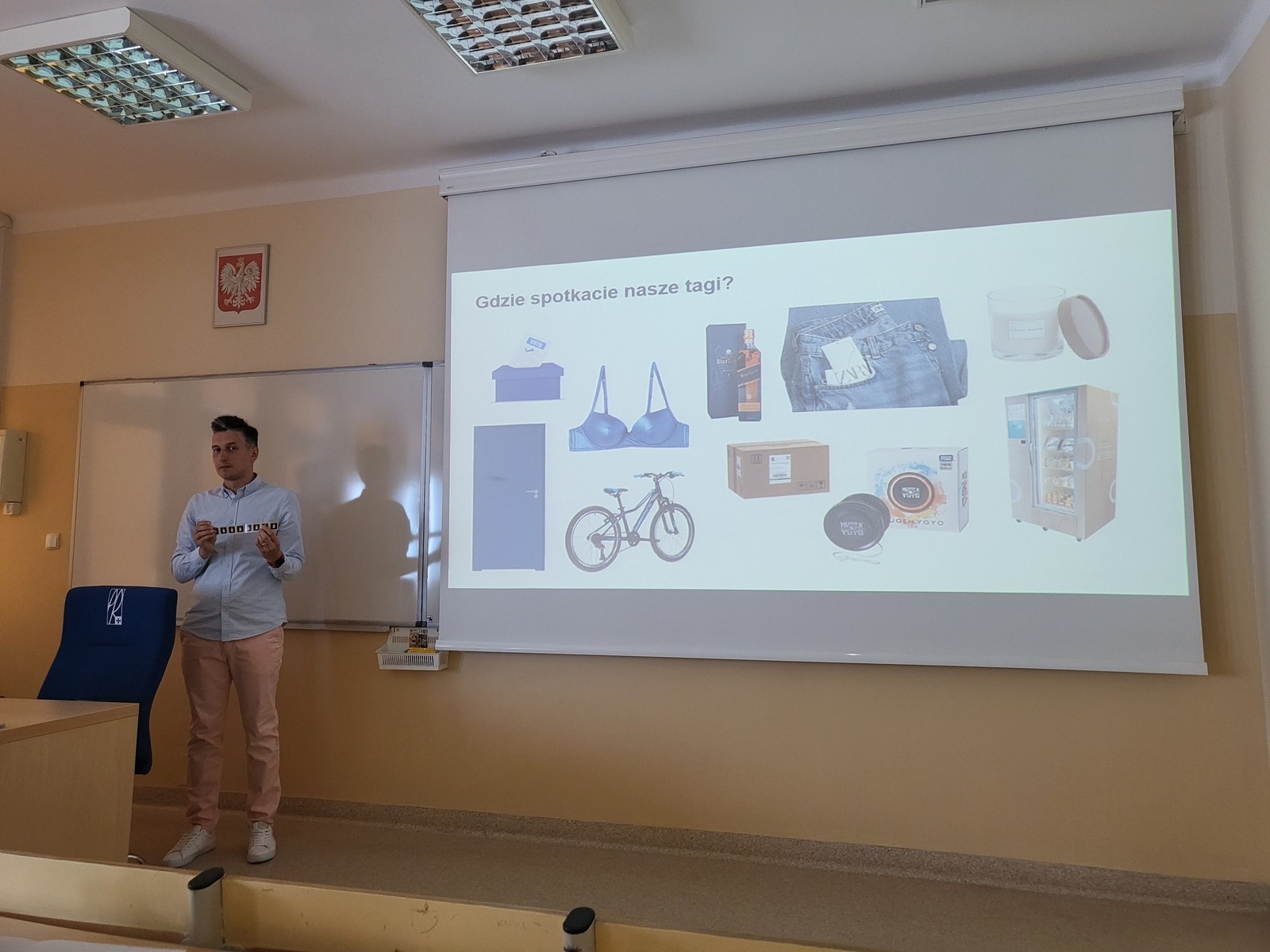W dniu 6 czerwca 2023 roku studenci ostatniego semestru studiów II stopnia na kierunku elektronika i telekomunikacja, w ramach kończących się zajęć z modułu pn. technika radiowej identyfikacji obiektów, mieli okazję do spotkania się z przedstawicielami firmy Talkin’ Things, które zostało zorganizowane z inicjatywy dra hab. inż. Piotra Jankowskiego-Mihułowicza, prof. PRz. W trakcie spotkania odbył się wykład, podczas którego mgr inż. Wojciech Lichoń (Head of R&D), mgr inż. Damian Kawalec (RFID Expert/Sales Manager) oraz mgr inż. Mateusz Chamera (Lead of RFID Tag Development) wpierw zaprezentowali studentom Wydziału Elektrotechniki i Informatyki swoje sylwetki zawodowe, a następnie przedstawili projektowo-produkcyjny profil działalności firmy w zakresie techniki RFID. Podczas prezentacji omawiane były konkretne przykłady projektowania, prototypowania i produkcji w Talkin’ Things identyfikatorów RFID, które znajdują powszechne zastosowania w zautomatyzowanych procesach takich firm, jak np.: Decathlon, Inditex, Boehringer Ingelheim, Sato, Nestle, Calzedonia, L'Oréal, Sanofi, Mango, Goodwill, Mars, Coca-Cola, GSK, P&G, TAKARA-TOMY Company. Było to doskonałe uzupełnienie wiedzy, jaką studenci zdobywali podczas realizowanych zajęć dydaktycznych w przedmiotowym zakresie.