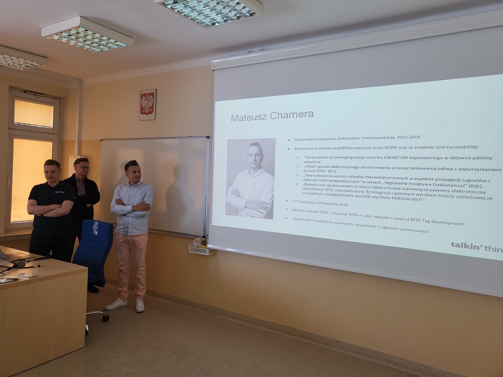 Na podkreślenie zasługuje fakt, że obecni przedstawiciele firmy Talkin’ Things są absolwentami tego samego kierunku studiów, co zebrani słuchacze wykładu, a swoje pierwsze doświadczenia zawodowe zdobywali w zaawansowanych projektach B+R+W realizowanych dla partnerów przemysłowych w KSEiT. Można więc powiedzieć, że kluczowy potencjał badawczo-rozwojowy firmy Talkin’ Things został zbudowany na zasobach ludzkich wykształconych przede wszystkim w zespole techniki RFID w KSEiT PRz. Zaplecze to wpierw było rozwijane w pomieszczeniach budynku A na WEiI, a aktualnie funkcjonuje w Rudnej Małej (Talkin’ Things R&D Hub). W chwili obecnej firma Talkin’ Things posiada w Warszawie linie produkcyjne, na których wytwarza znaczniki RFID autorsko opracowane w Talkin’ Things R&D Hub. W niedługim czasie to zaplecze produkcyjne zostanie rozszerzone o nowo budowaną siedzibę B+R i zakład produkcyjny na Dworzysku. Znaczące jest więc to, że na podstawie potencjału intelektualnego, który został wytworzony w zakresie techniki RFID w KSEiT PRz, można budować tak innowacyjne przedsięwzięcia w gospodarce na Podkarpaciu, co w miły sposób zostało zasygnalizowane gromkimi brawami, jakimi studenci WEiI podziękowali przybyłym przedstawicielom firmy Talkin’ Things.