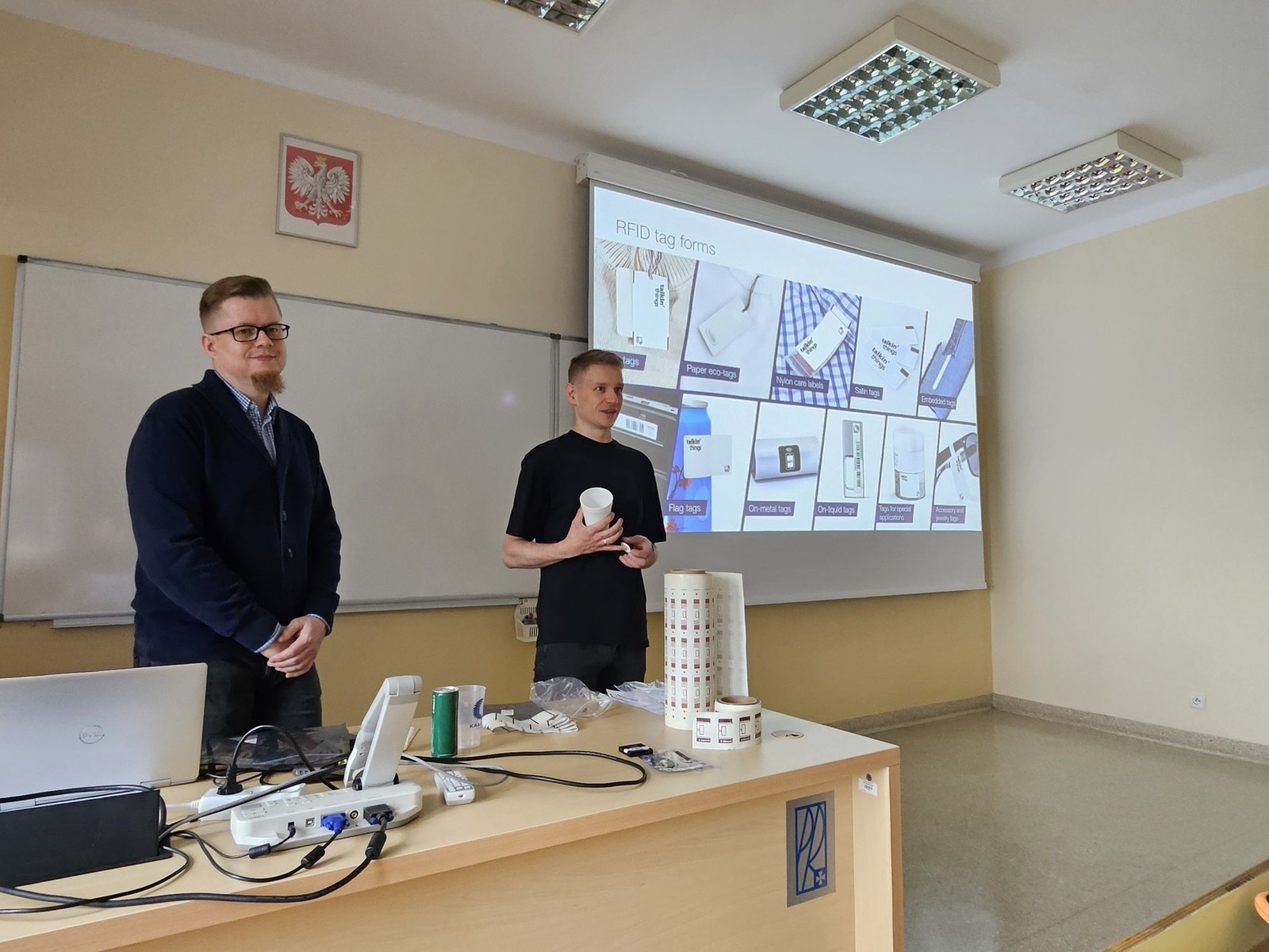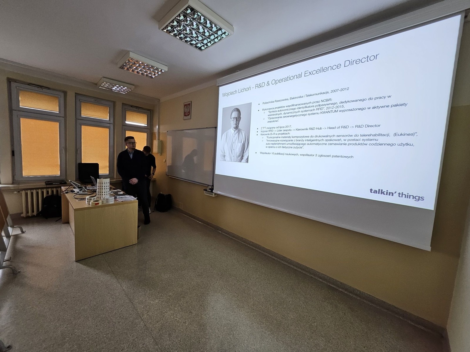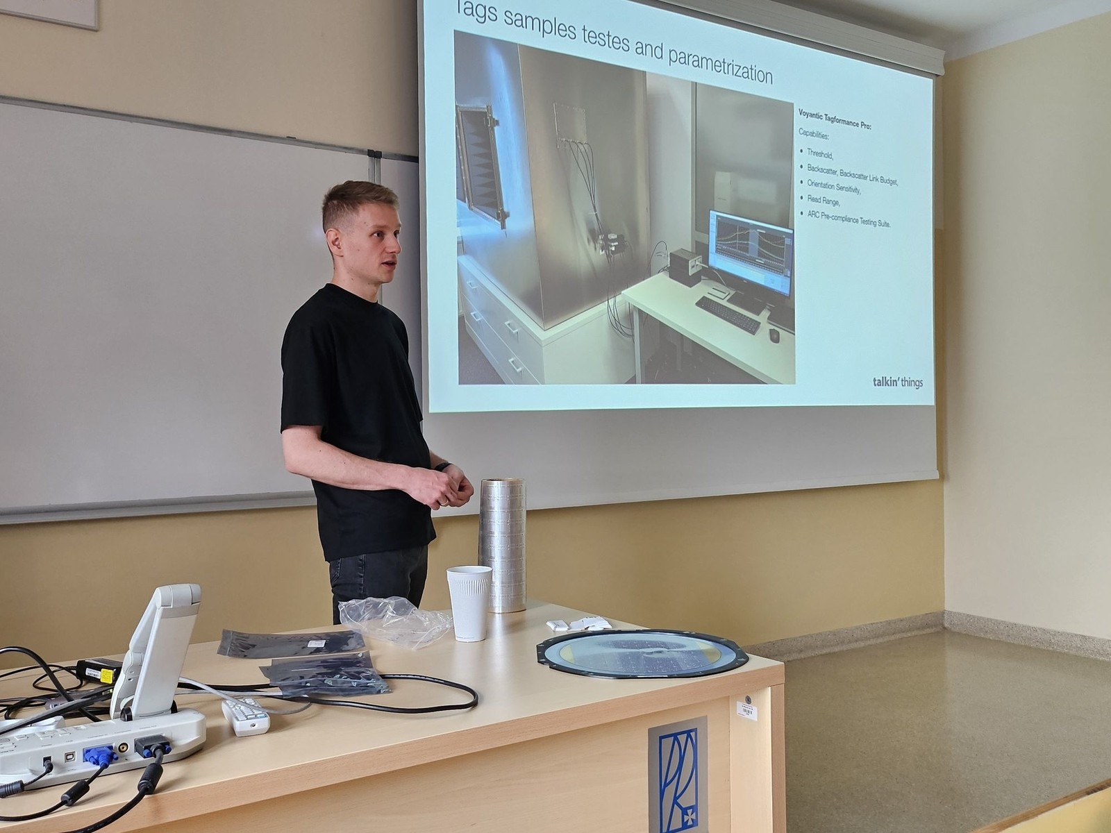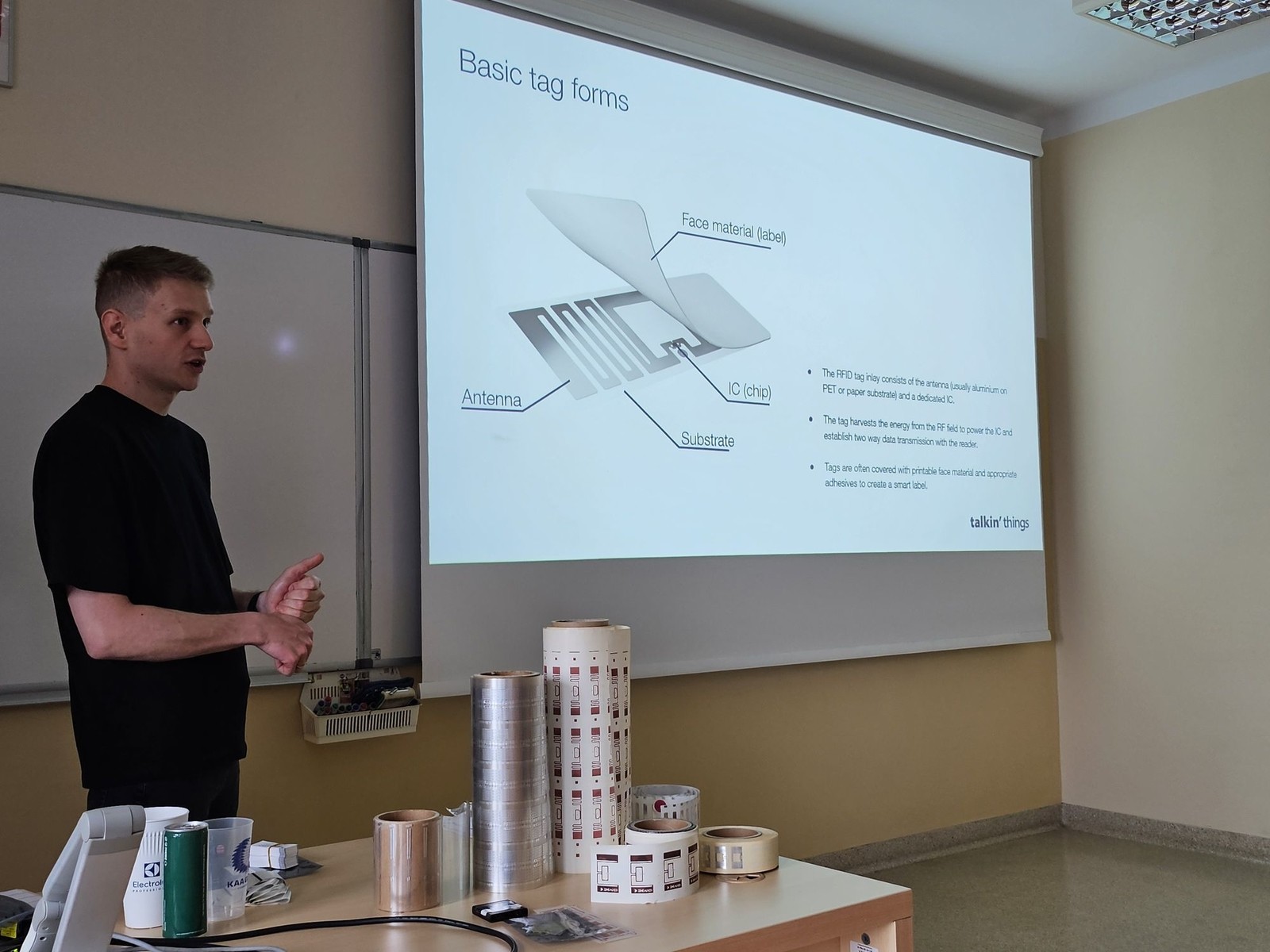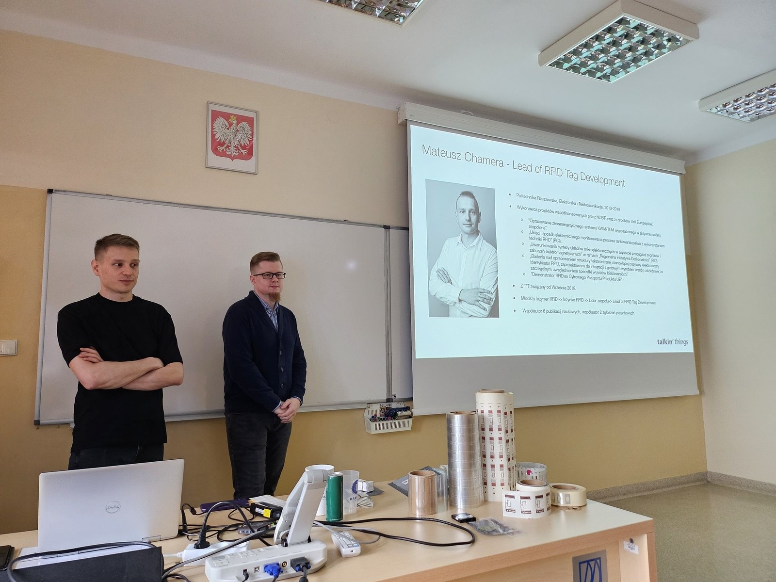 W dniu 3 czerwca 2025 roku studenci ostatniego semestru studiów II stopnia na kierunku elektronika i telekomunikacja, w ramach kończących się zajęć z modułu pn. technika radiowej identyfikacji obiektów, mieli okazję do spotkania się z przedstawicielami Talkin Things SA, które zostało zorganizowane z inicjatywy dra hab. inż. Piotra Jankowskiego-Mihułowicza, prof. PRz w ramach Politechnicznej Sieci VIA CARPATIA. W trakcie spotkania odbył się wykład, podczas którego mgr inż. Wojciech Lichoń (R&D Director) oraz mgr inż. Mateusz Chamera (Lead of RFID Tag Development) wpierw zaprezentowali studentom Wydziału Elektrotechniki i Informatyki swoje sylwetki zawodowe, a następnie przedstawili projektowo-produkcyjny profil działalności firmy w zakresie techniki RFID. Podczas prezentacji omawiane były konkretne przykłady projektowania, prototypowania i produkcji w Talkin Things identyfikatorów RFID, które znajdują powszechne zastosowania w zautomatyzowanych procesach takich firm, jak np.: Decathlon, Inditex, Boehringer Ingelheim, Sato, Nestle, Calzedonia, L'Oréal, Sanofi, Mango, Goodwill, Mars, Coca-Cola, GSK, P&G, TAKARA-TOMY Company. Prezentacja była wzbogacona pokazami półfabrykatów projektowanych anten, wafli krzemowych z chipami wykorzystywanymi w procesie produkcji, a także finalnych rozwiązań konstrukcyjnych identyfikatorów RFID. Było to doskonałe uzupełnienie wiedzy, jaką studenci zdobywali podczas zajęć dydaktycznych realizowanych w przedmiotowym zakresie.