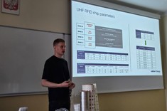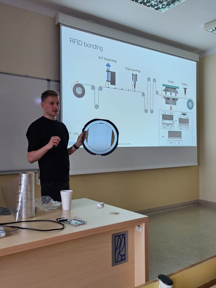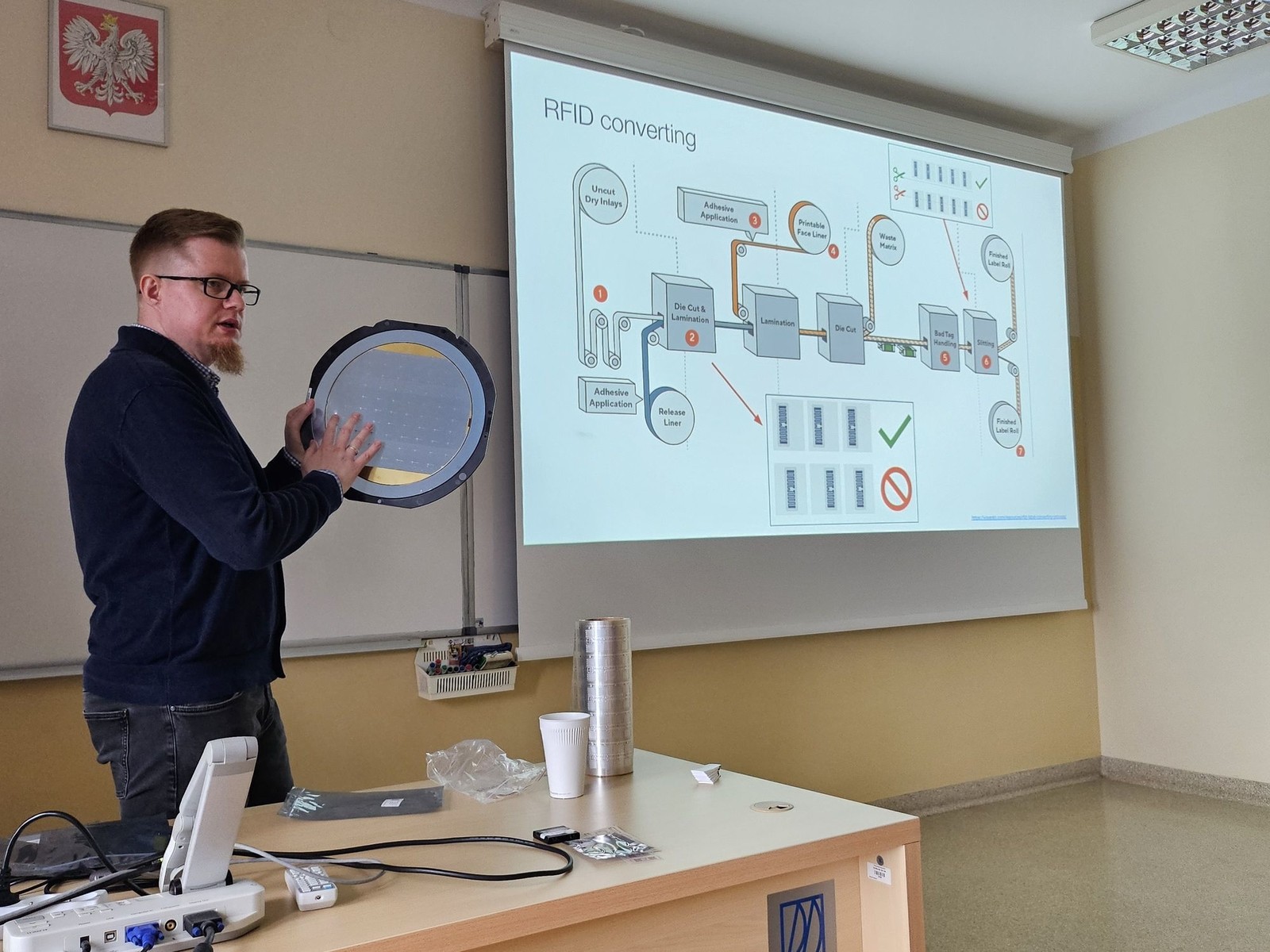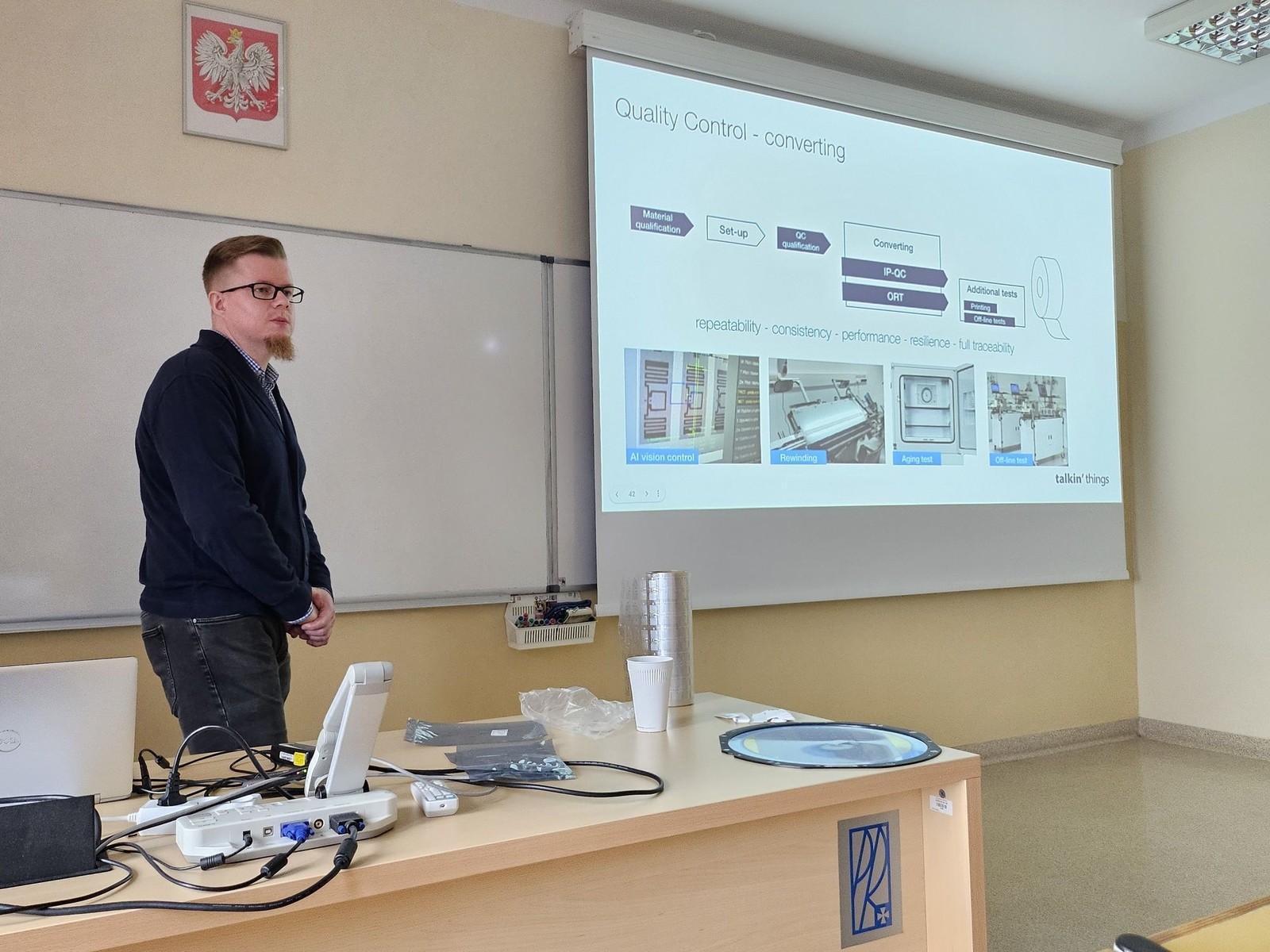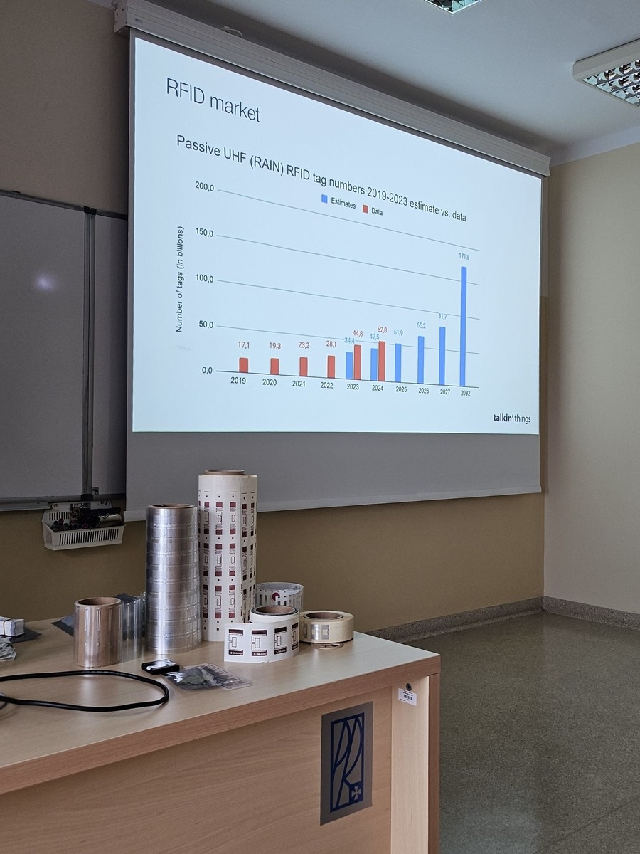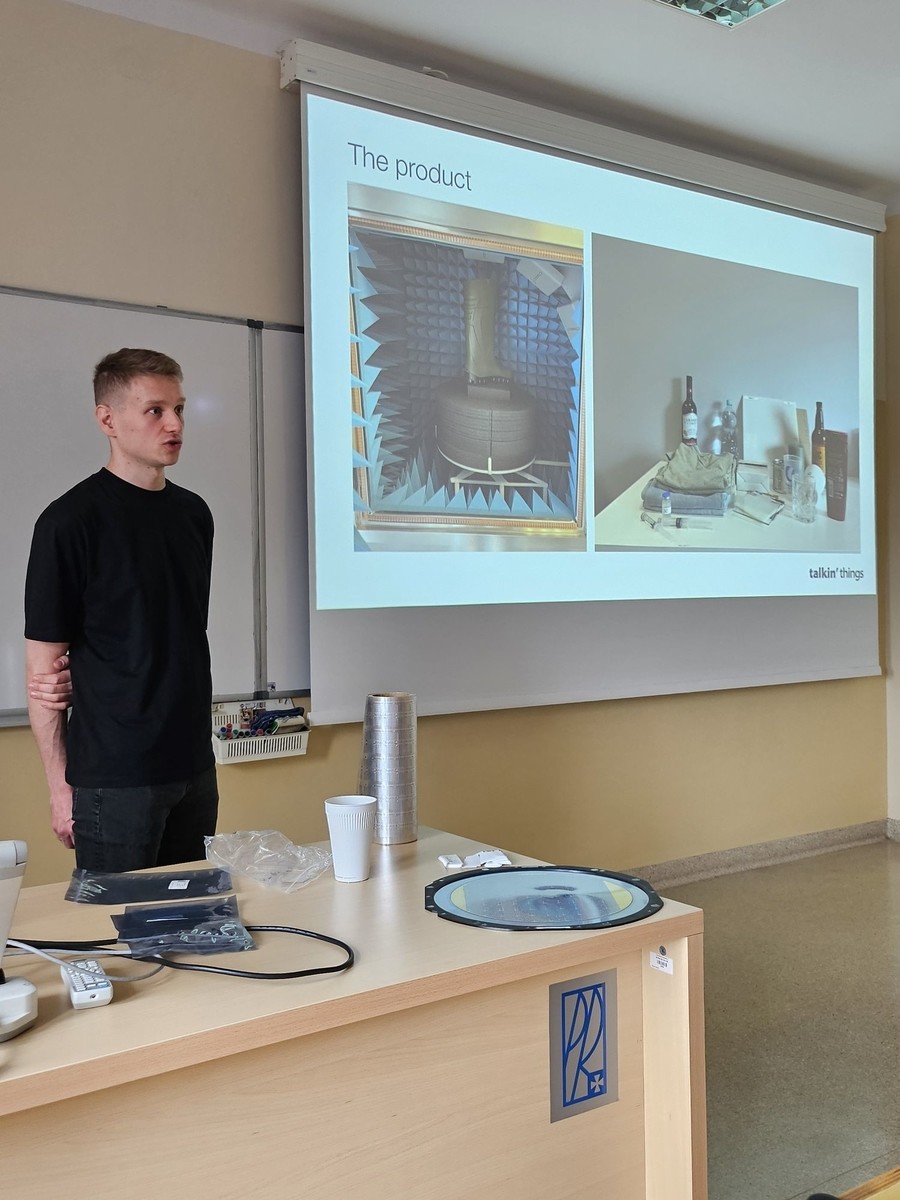 W dniu 3 czerwca 2025 roku studenci ostatniego semestru studiów II stopnia na kierunku elektronika i telekomunikacja, w ramach kończących się zajęć z modułu pn. technika radiowej identyfikacji obiektów, mieli okazję do spotkania się z przedstawicielami Talkin Things SA, które zostało zorganizowane z inicjatywy dra hab. inż. Piotra Jankowskiego-Mihułowicza, prof. PRz w ramach Politechnicznej Sieci VIA CARPATIA. W trakcie spotkania odbył się wykład, podczas którego mgr inż. Wojciech Lichoń (R&D Director) oraz mgr inż. Mateusz Chamera (Lead of RFID Tag Development) wpierw zaprezentowali studentom Wydziału Elektrotechniki i Informatyki swoje sylwetki zawodowe, a następnie przedstawili projektowo-produkcyjny profil działalności firmy w zakresie techniki RFID. Podczas prezentacji omawiane były konkretne przykłady projektowania, prototypowania i produkcji w Talkin Things identyfikatorów RFID, które znajdują powszechne zastosowania w zautomatyzowanych procesach takich firm, jak np.: Decathlon, Inditex, Boehringer Ingelheim, Sato, Nestle, Calzedonia, L'Oréal, Sanofi, Mango, Goodwill, Mars, Coca-Cola, GSK, P&G, TAKARA-TOMY Company. Prezentacja była wzbogacona pokazami półfabrykatów projektowanych anten, wafli krzemowych z chipami wykorzystywanymi w procesie produkcji, a także finalnych rozwiązań konstrukcyjnych identyfikatorów RFID. Było to doskonałe uzupełnienie wiedzy, jaką studenci zdobywali podczas zajęć dydaktycznych realizowanych w przedmiotowym zakresie.