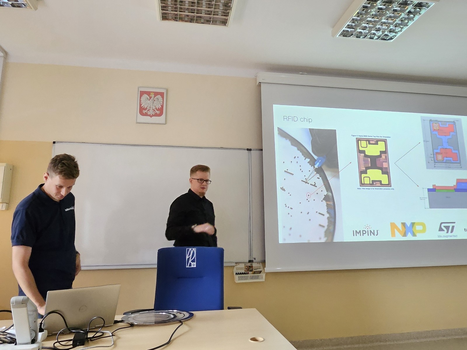 W dniu 4 czerwca 2024 roku studenci ostatniego semestru studiów II stopnia na kierunku elektronika i telekomunikacja, w ramach kończących się zajęć z modułu pn. technika radiowej identyfikacji obiektów, mieli okazję do spotkania się z przedstawicielami Talkin Things SA, które zostało zorganizowane z inicjatywy dra hab. inż. Piotra Jankowskiego-Mihułowicza, prof. PRz w ramach Politechnicznej Sieci VIA CARPATIA im. Prezydenta RP Lecha Kaczyńskiego. Spółkę reprezentowali: Paweł Tomczak (CEO, Vice-President of the Management Board), Wojciech Lichoń (R&D Director) oraz Mateusz Chamera (Lead of RFID Tag Development). W trakcie spotkania odbył się wykład, podczas którego mgr inż. Wojciech Lichoń oraz mgr inż. Mateusz Chamera wpierw zaprezentowali studentom Wydziału Elektrotechniki i Informatyki swoje sylwetki zawodowe, a następnie przedstawili projektowo-produkcyjny profil działalności firmy w zakresie techniki RFID. Podczas prezentacji omawiane były konkretne przykłady projektowania, prototypowania i produkcji w Talkin Things identyfikatorów RFID, które znajdują powszechne zastosowania w zautomatyzowanych procesach takich firm, jak np.: Decathlon, Inditex, Boehringer Ingelheim, Sato, Nestle, Calzedonia, L'Oréal, Sanofi, Mango, Goodwill, Mars, Coca-Cola, GSK, P&G, TAKARA-TOMY Company. Prezentacja była wzbogacona pokazami półfabrykatów projektowanych anten, wafli krzemowych z chipami wykorzystywanymi w procesie produkcji, a także finalnych rozwiązań konstrukcyjnych identyfikatorów RFID. Było to doskonałe uzupełnienie wiedzy, jaką studenci zdobywali podczas zajęć dydaktycznych realizowanych w przedmiotowym zakresie.