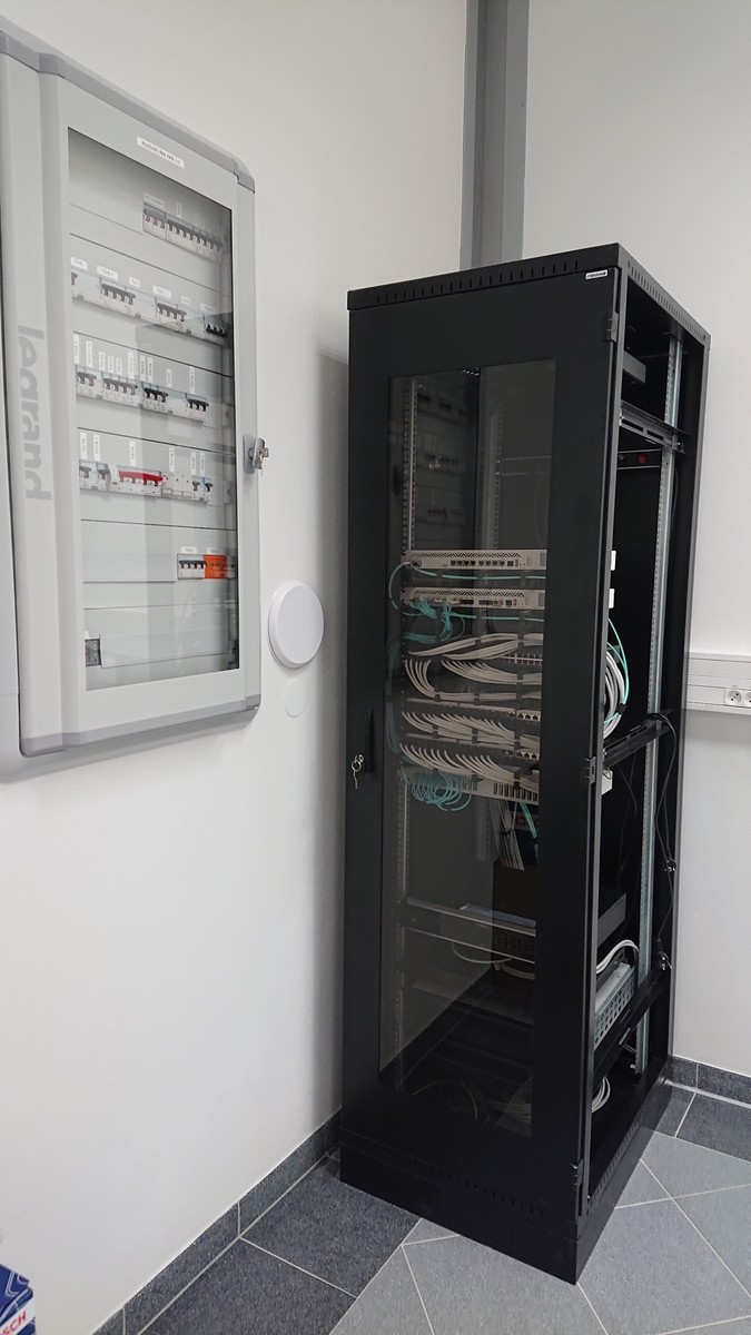Na drugiej kondygnacji nowej części budynku AL zaplanowano zainstalowanie systemu antenowego, który zostanie ulokowany w komorze bezodbiciowej o zewnętrznych rozmiarach geometrycznych nie większych niż 4,8x4,8x4,4 m (szerokość, głębokość, wysokość). Współcześnie można zauważyć intensywny rozwój systemów bezprzewodowej transmisji danych, które znajdują szerokie zastosowanie w różnych obszarach życia i gospodarki, dlatego przygotowywane stanowisko zostanie wykorzystane do badań anten, urządzeń i kompletnych systemów radiokomunikacyjnych pracujących w zakresie częstotliwości od 400 MHz do 18 GHz. W skład przedmiotowej części zakresu rzeczowego projektu ma wejść antenowa komora bezodbiciowa, składowe elementy systemu pomiarowego, wektorowy analizatora obwodów oraz tester systemów telekomunikacyjnych (analizator sygnałów), które w całości umożliwią realizację sferycznych pomiarów parametrów anten i urządzeń radiowych. Koncepcja budowania systemów do pomiaru charakterystyki promieniowania w strefie bliskiej (ang. near field) z transpozycją uzyskanych wyników do strefy dalekiej (ang. far field) za pomocą dwuwymiarowej transformaty Fouriera, należy obecnie do najczęściej stosowanych. Głównymi powodami takiej konstrukcji są szybkość wykonywania pomiarów oraz niewielkie rozmiary komory bezodbiciowej, co znacząco usprawnia i obniża koszty zaplanowanych badań.
