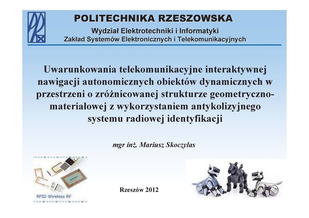 - Mariusz Skoczylas, Uwarunkowania telekomunikacyjne interaktywnej nawigacji autonomicznych obiektów dynamicznych w przestrzeni o zróżnicowanej strukturze geometryczno-materiałowej z wykorzystaniem antykolizyjnego systemu radiowej identyfikacji