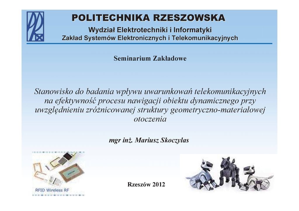- Mariusz Skoczylas, Stanowisko do badania wpływu uwarunkowań telekomunikacyjnych na efektywność procesu nawigacji obiektu dynamicznego przy uwzględnieniu zróżnicowanej struktury geometryczno-materiałowej otoczenia