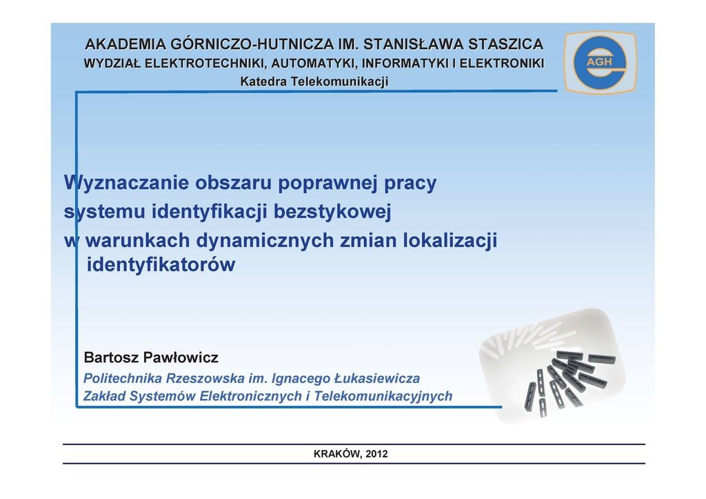 - Bartosz Pawłowicz, Wyznaczanie obszaru poprawnej pracy systemu identyfikacji bezstykowej w warunkach dynamicznych zmian lokalizacji identyfikatorów