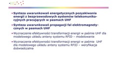- 2013-07-30 – Sabat Wiesław, Synteza uwarunkowań energetycznych pozyskiwania energii z bezprzewodowych systemów telekomunikacyjnych pracujących w pasmach UHF; Synteza uwarunkowań propagacji fal elektromagnetycznych w pasmach UHF; Wyznaczenie efektywności transformacji energii w paśmie UHF dla modelowego układu anteny systemu RFID – modelowanie; Wyznaczenie efektywności transformacji energii w paśmie UHF dla modelowego układu anteny systemu RFID – weryfikacja doświadczalna